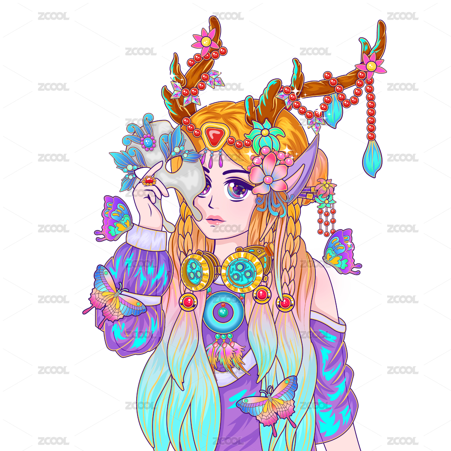 二次元矢量卡通鹿角少女潮流花神星座女孩