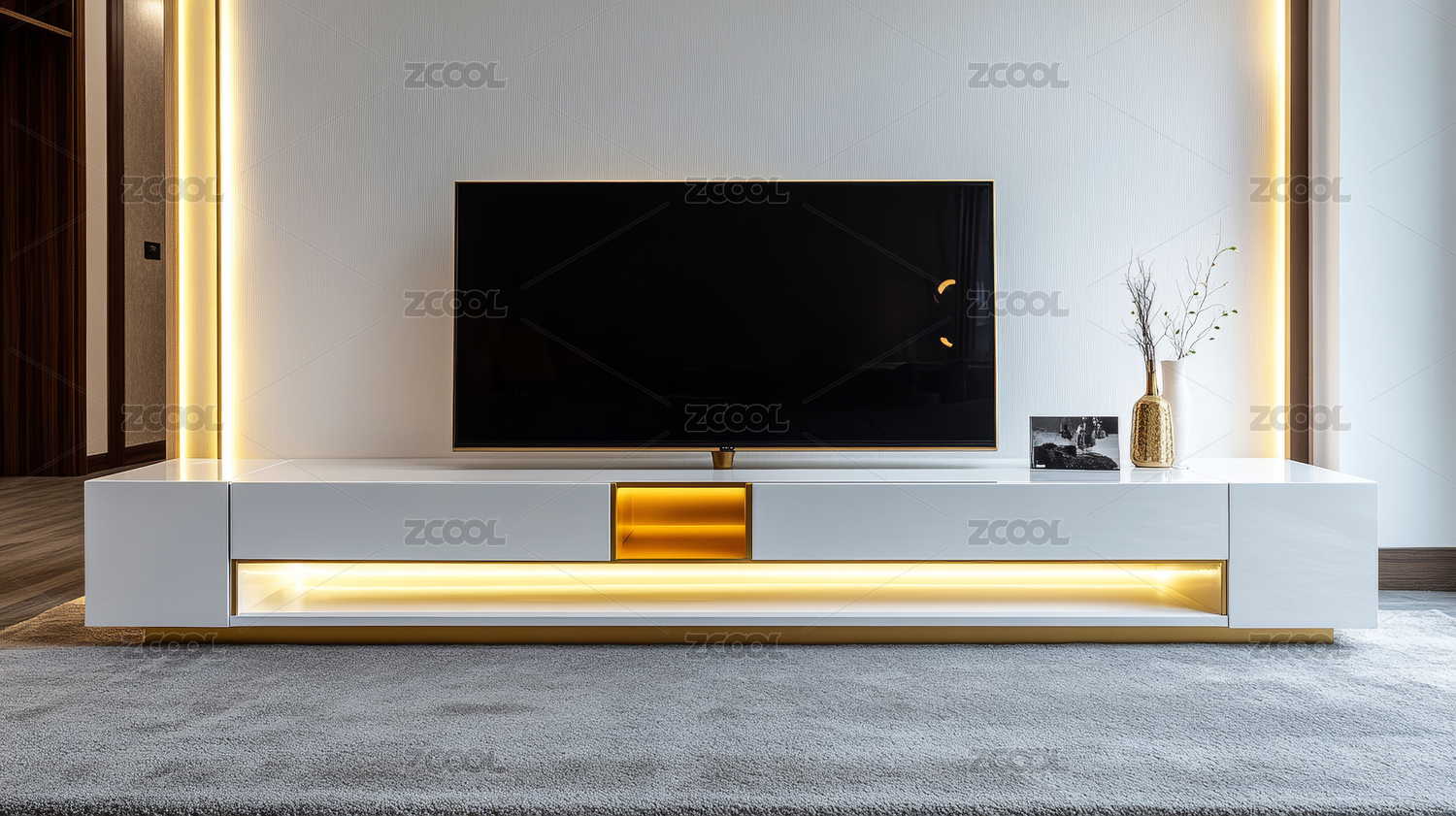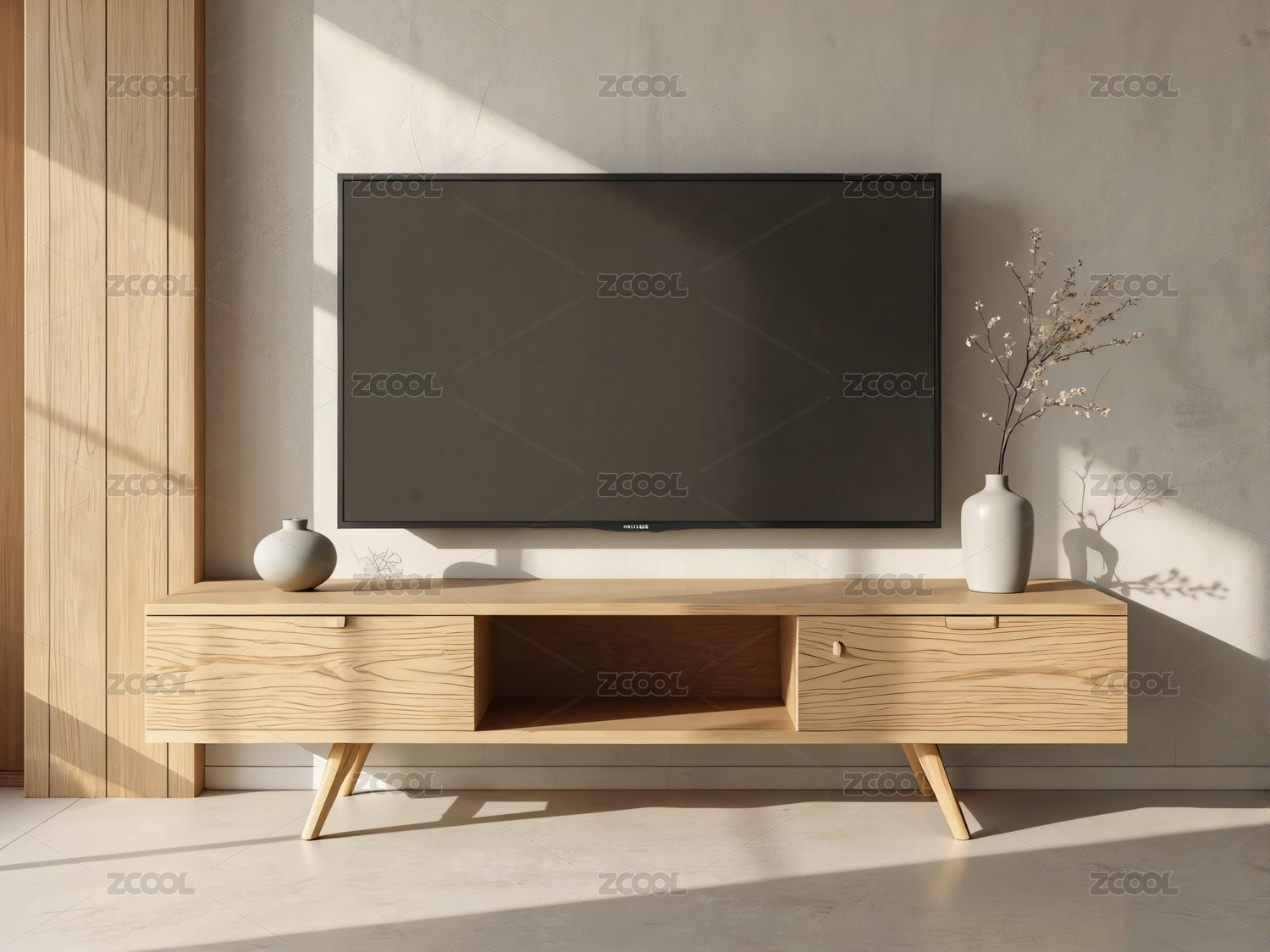 蓝色墙面壁纸下的木电视柜和现代时尚的客厅