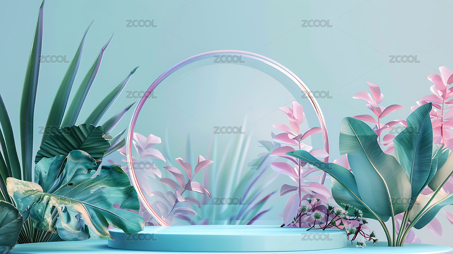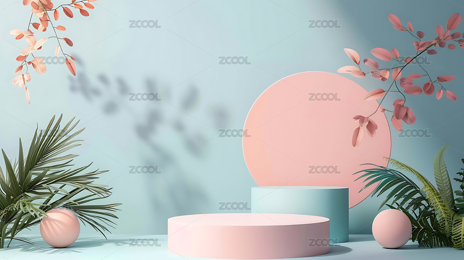 中式扇子背景组成的淡蓝色立体圆形产品平台