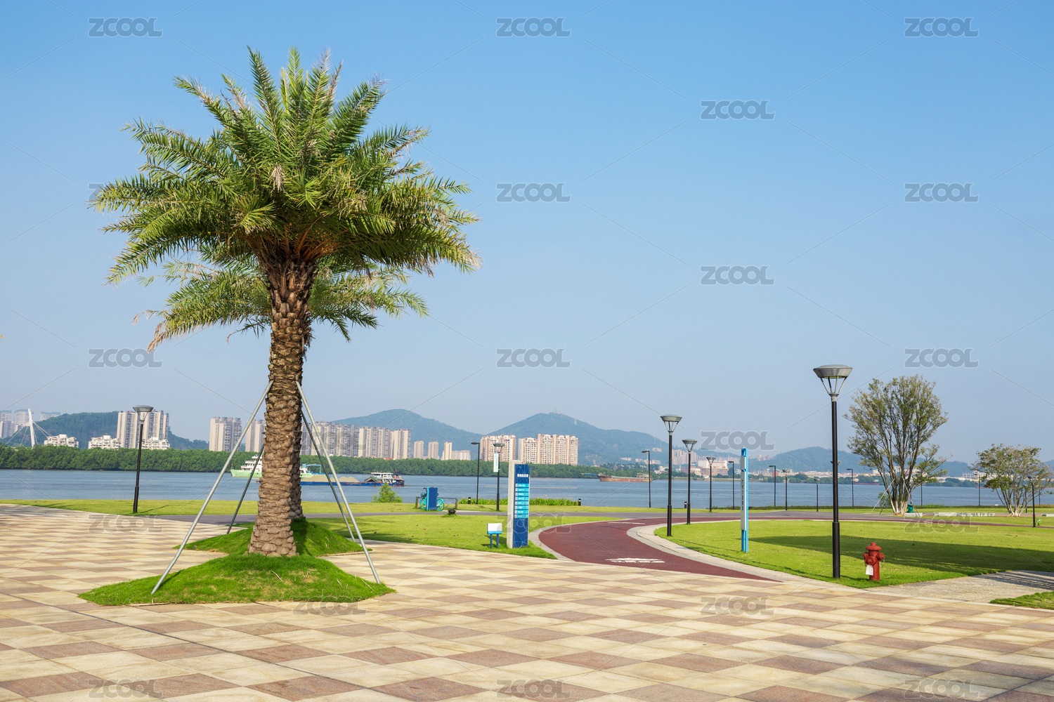 蓝天白云下的中国深圳防波堤海岸公园风光