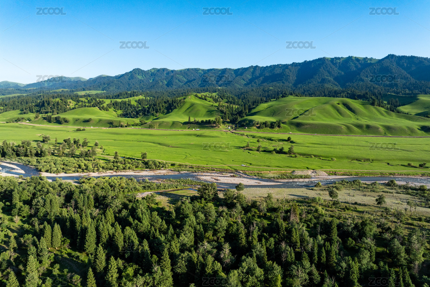 中国新疆伊犁那拉提草原云杉自然风光航拍