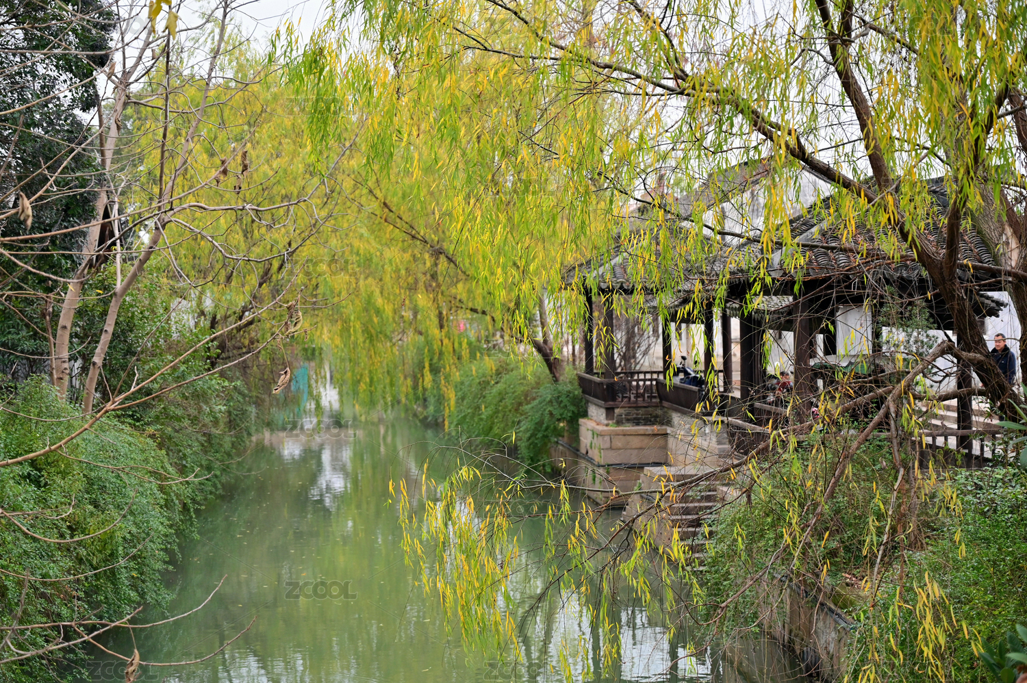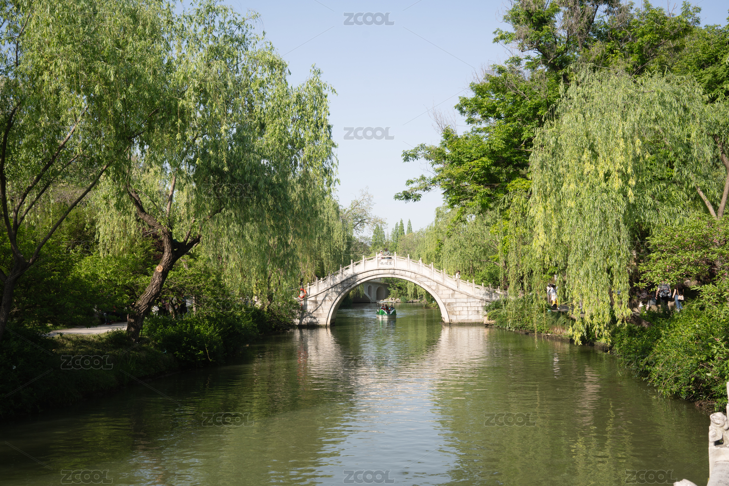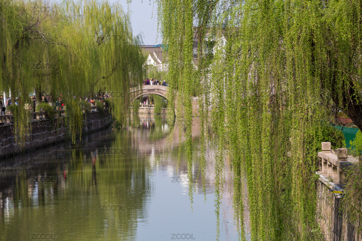 湖面古桥两岸柳树