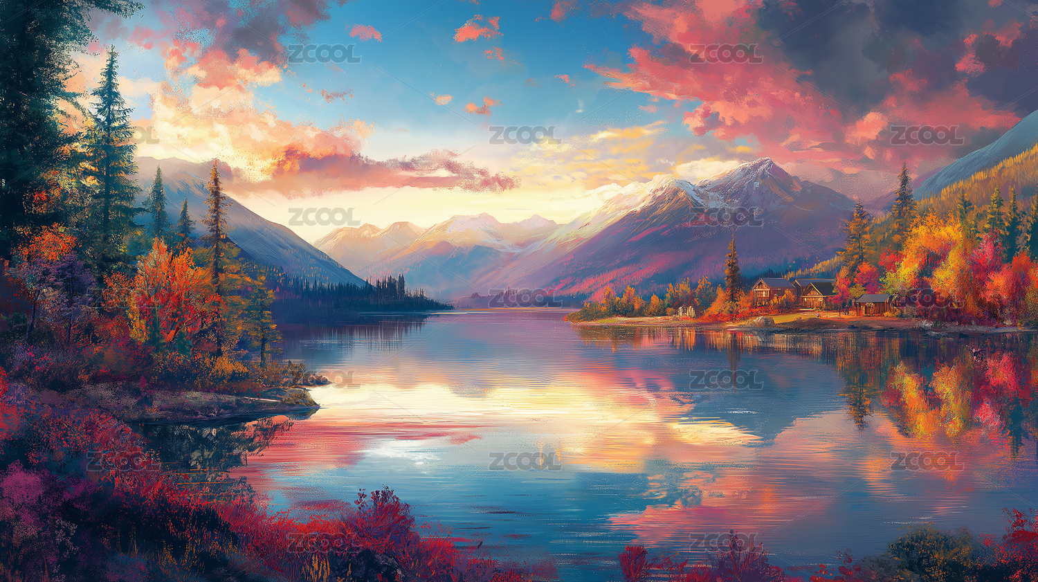 山湖映霞光辉美景