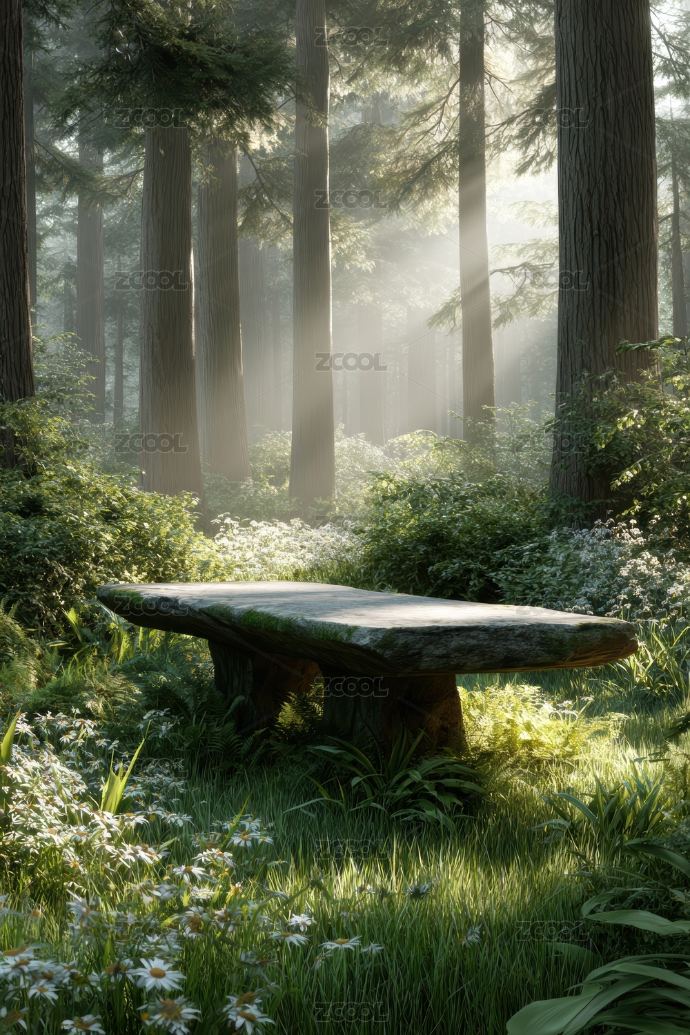 草地,树木,白色野花,绿色森林,蓝天,产品摄影,深度景深,顶部光源,幻灯效果,木质圆台