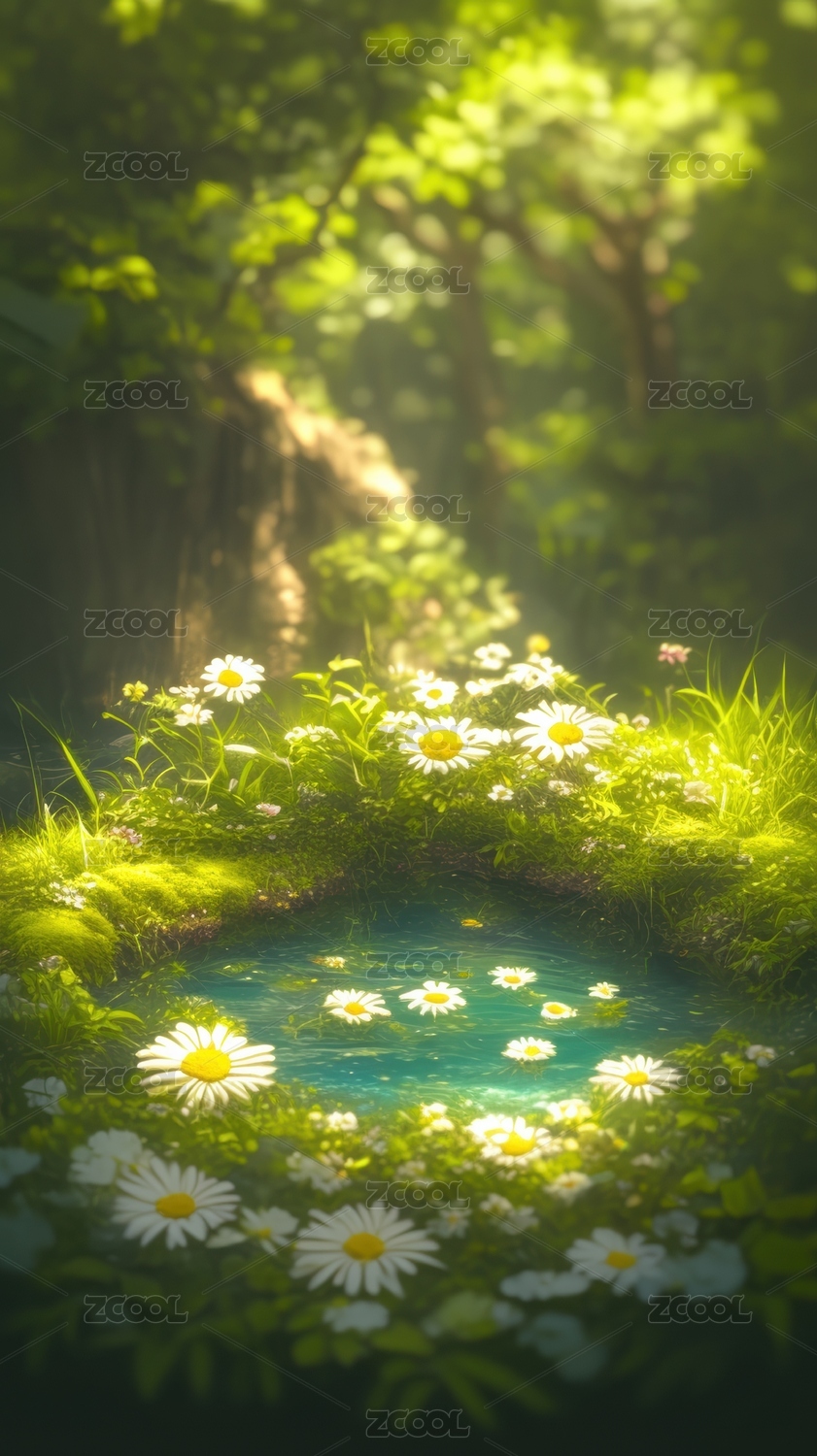 森林溪流旁的雏菊花丛