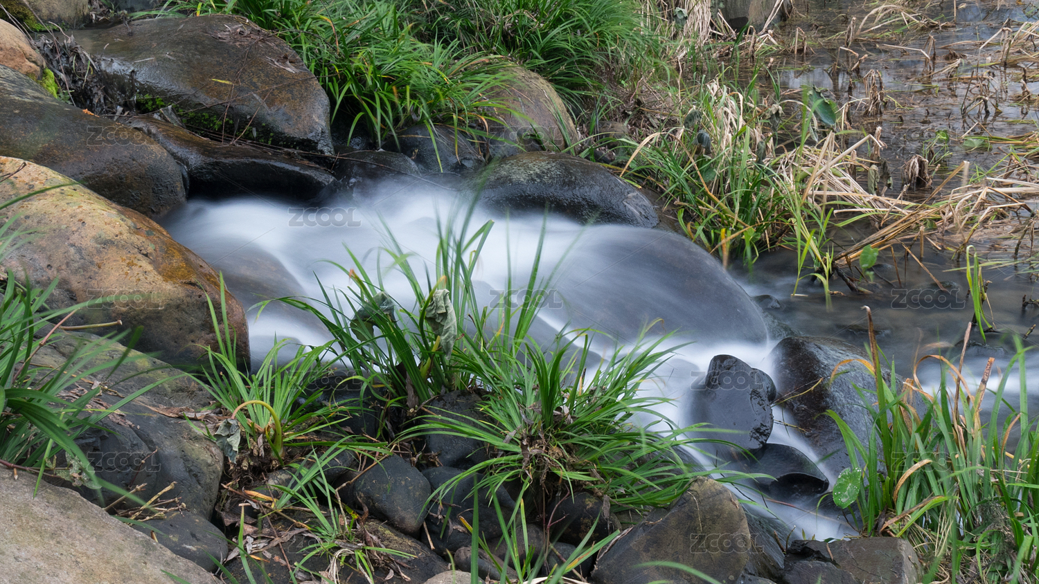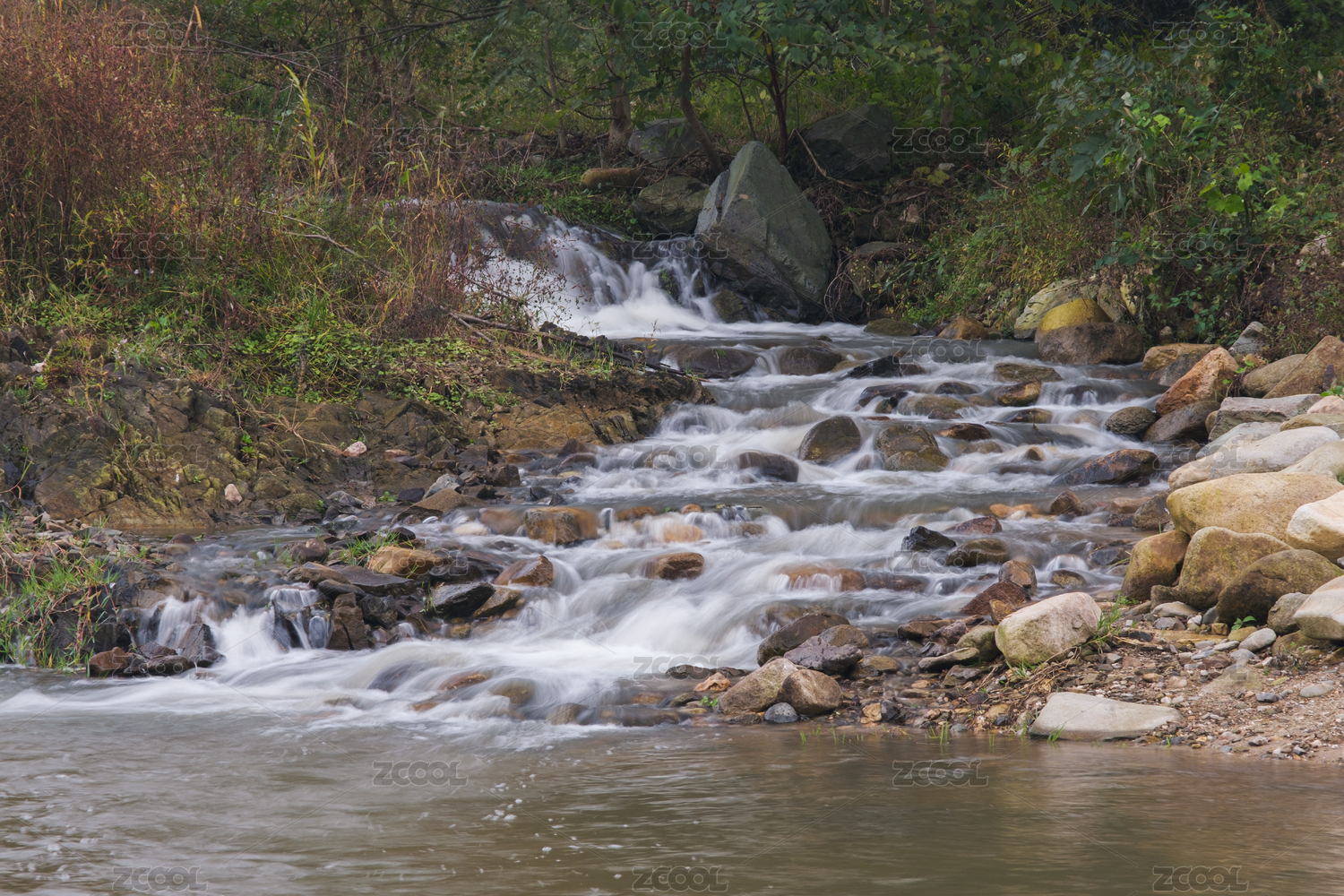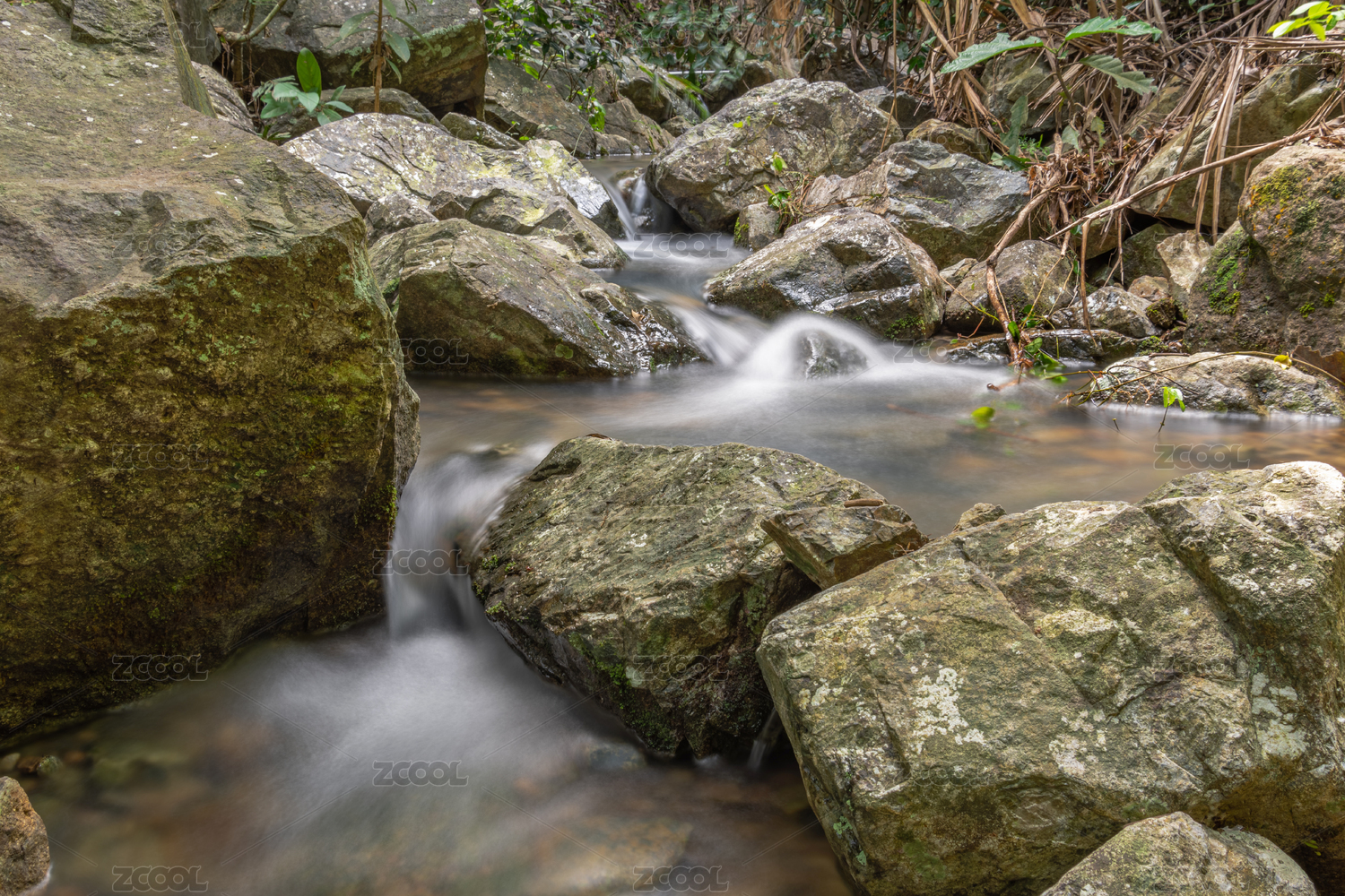 慢门拍摄的流淌过乱石河床的清澈的溪水,中国福建龙岩