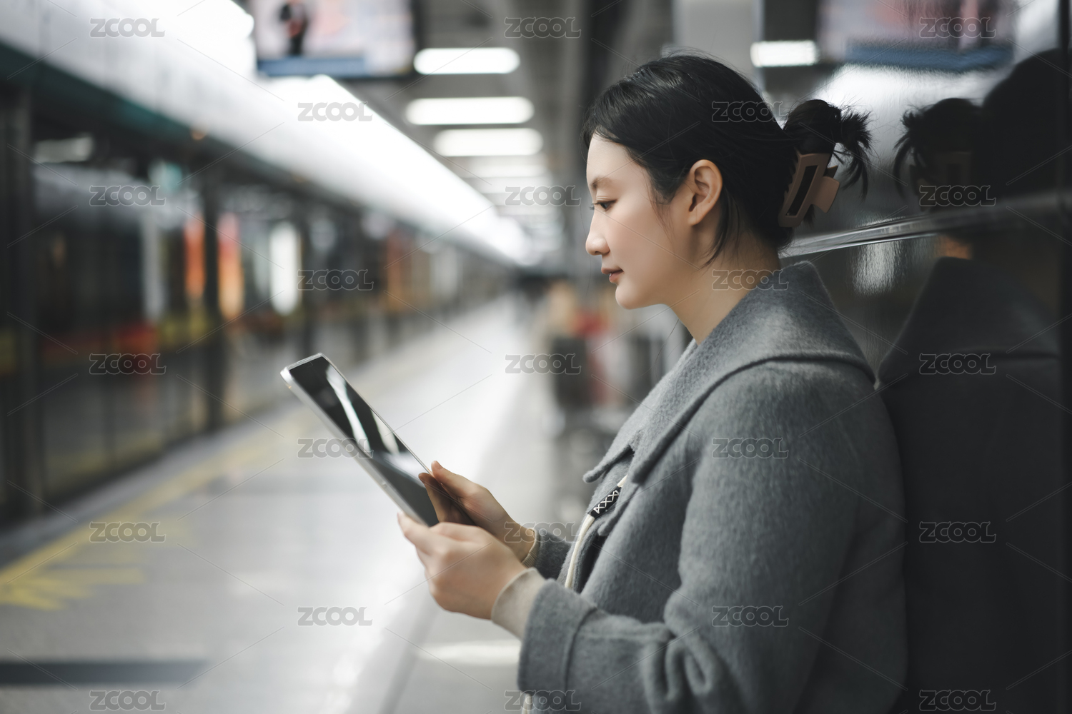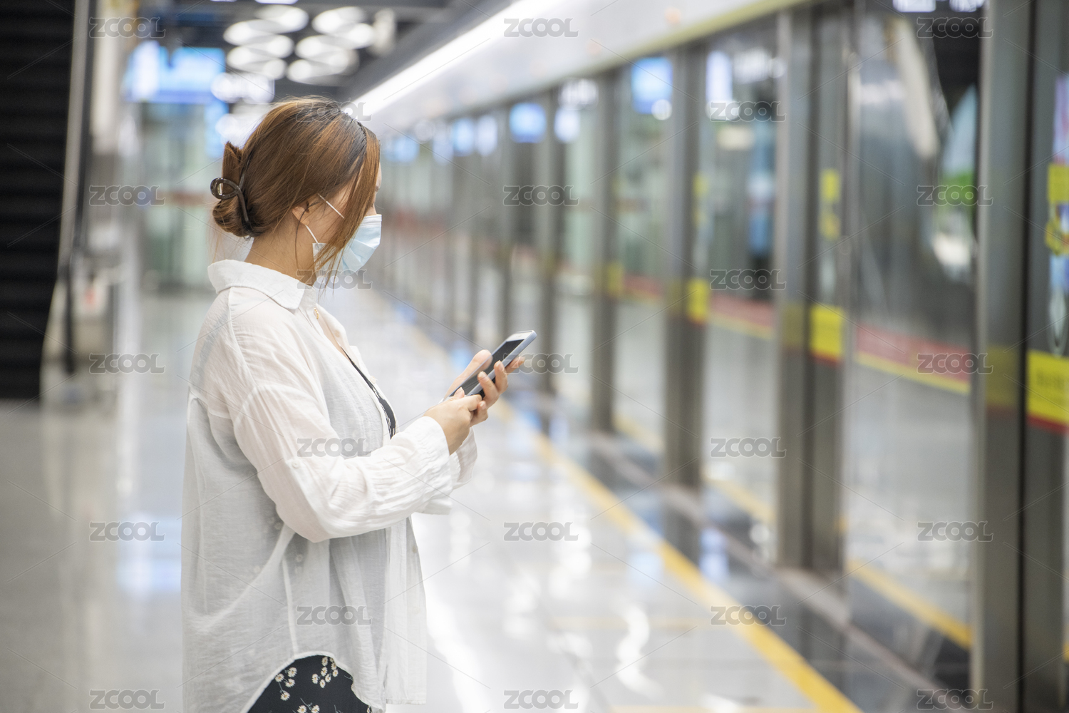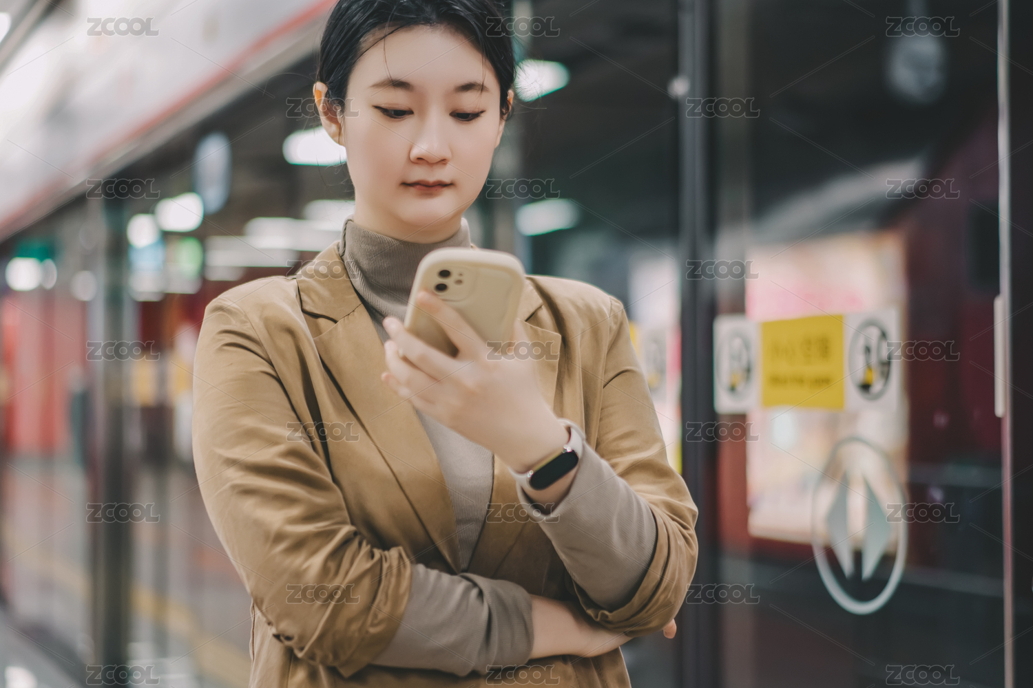 从平台站在站厅,手持智能手机寻找一个未来的征程上的年轻女子游出境。