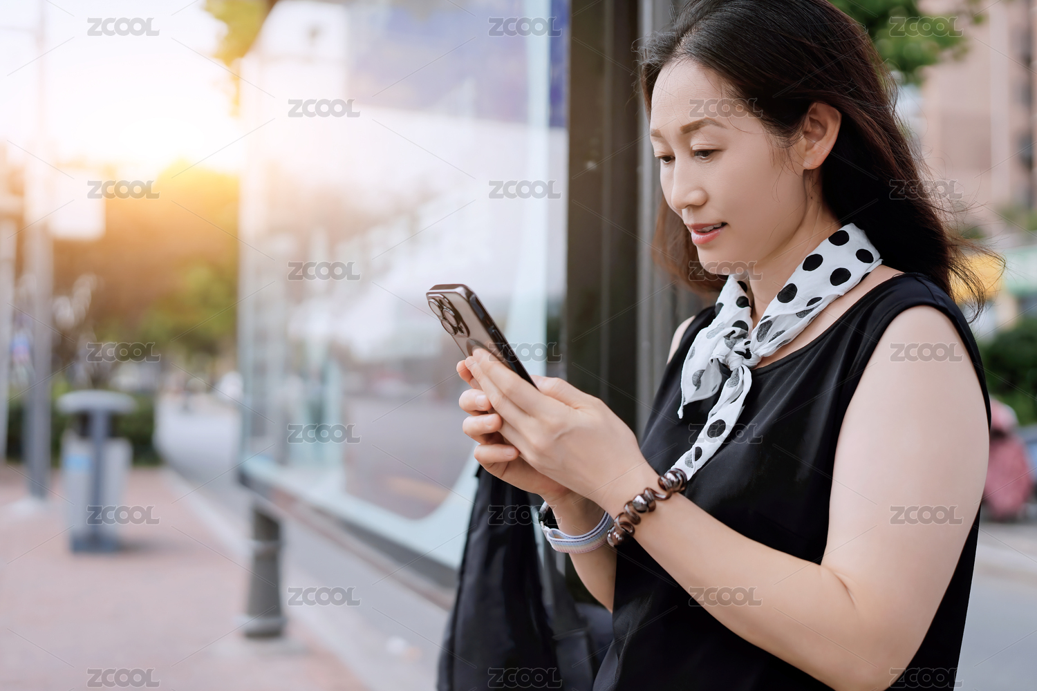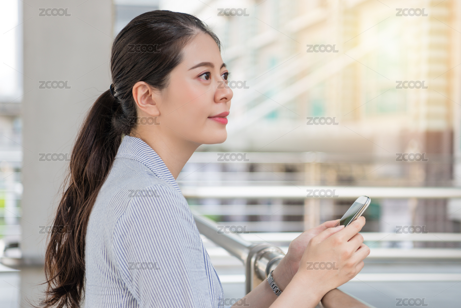 美丽的亚裔女商人盼望着列车准备在她的目的地站和短信与她的智能手机应用程序才能到达她的客户。
