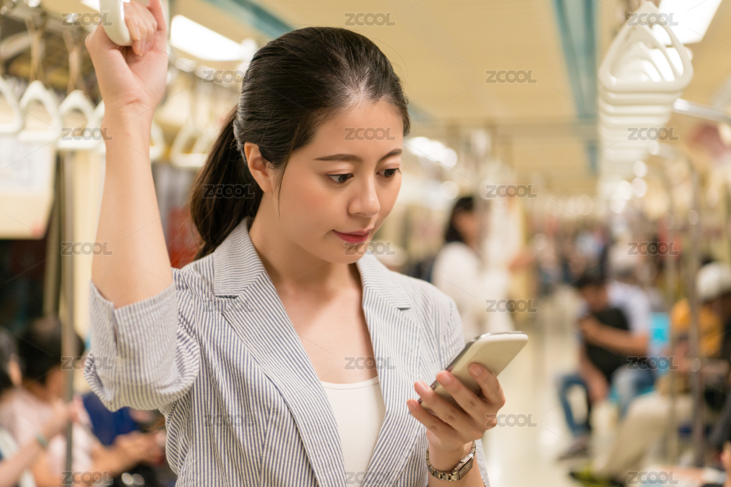 漂亮的亚洲办公室女郎智能手机阅读新闻信息并保持安全把手站在地下地铁列车。