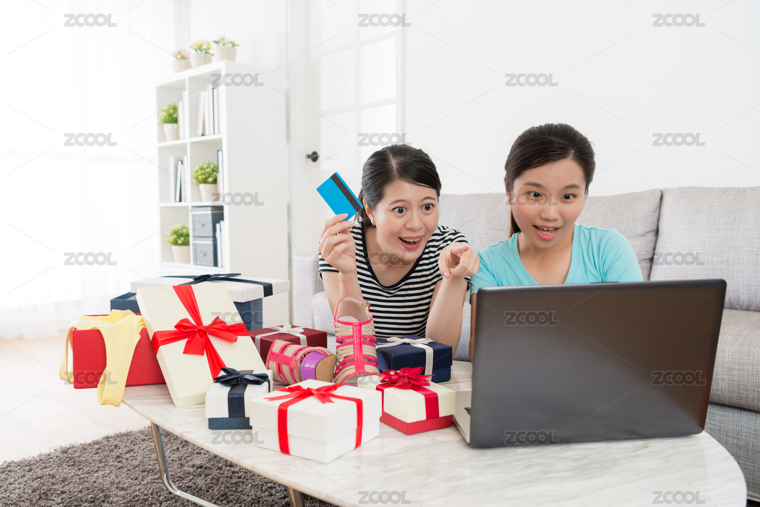 快乐有吸引力的女性朋友使用信用卡购买个人礼物,在线浏览购物网站寻找最好的商品。