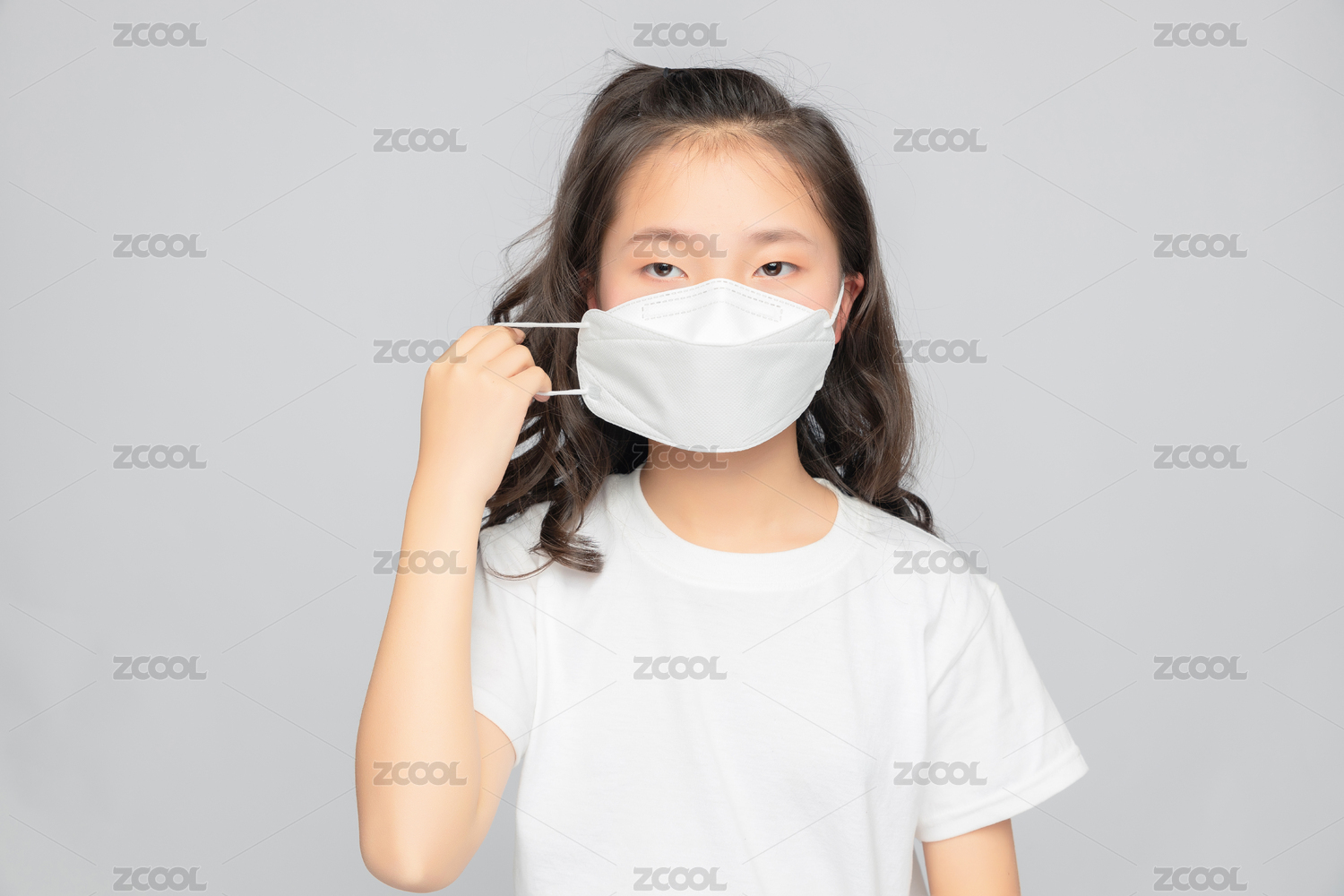 白色背景前身穿红色上衣戴口罩的亚洲小女孩