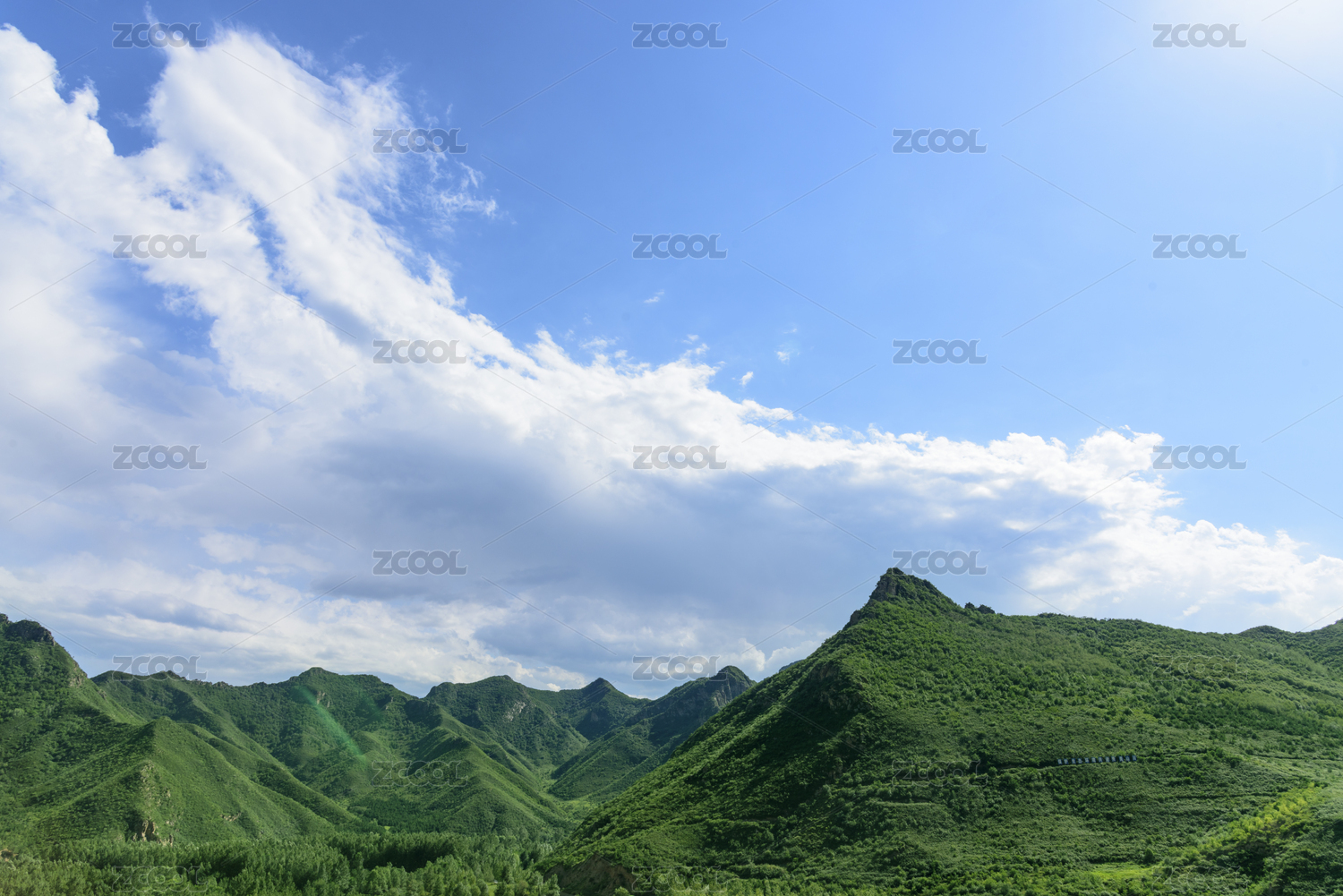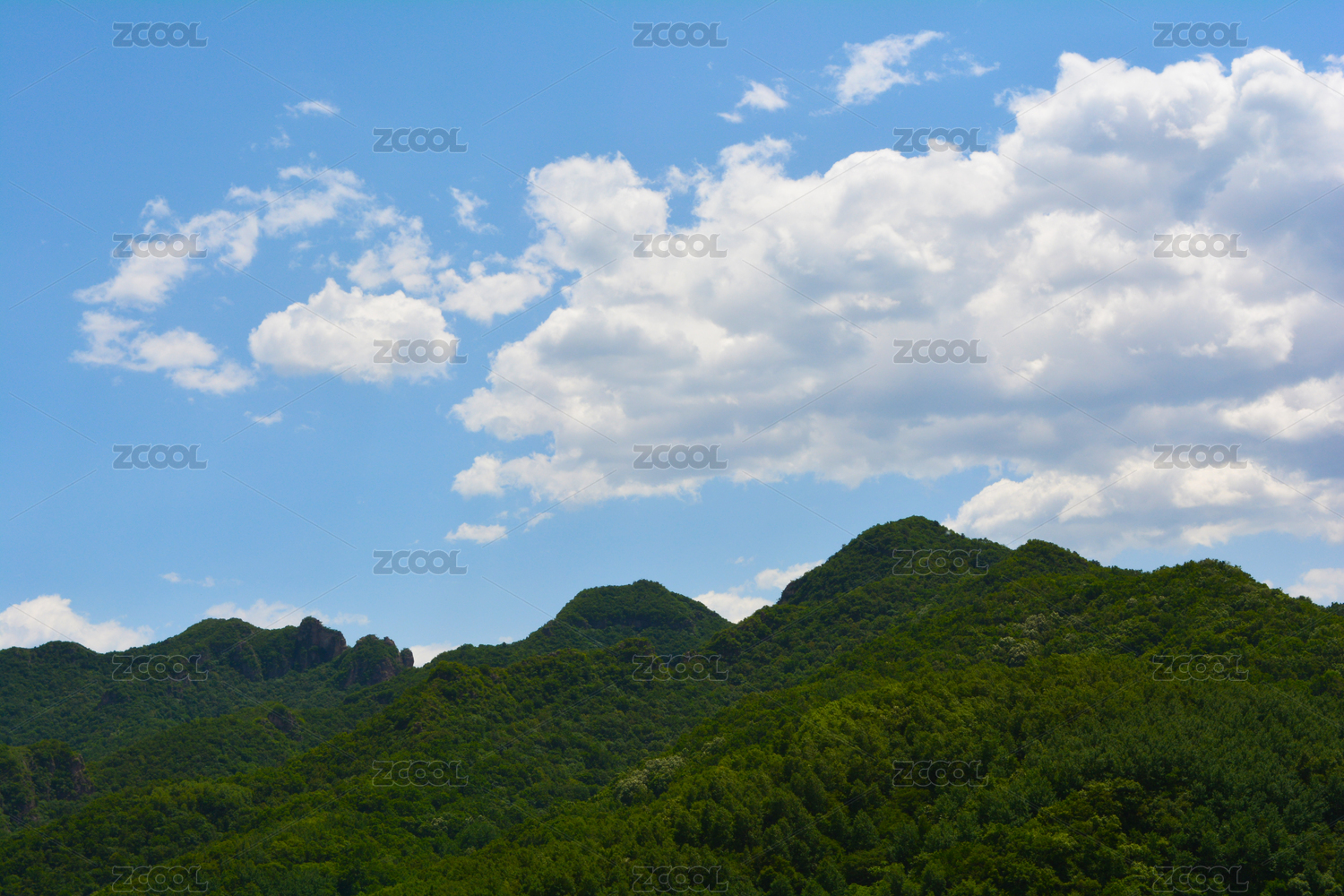 晴朗蓝天白云下绿色山脉树林风光