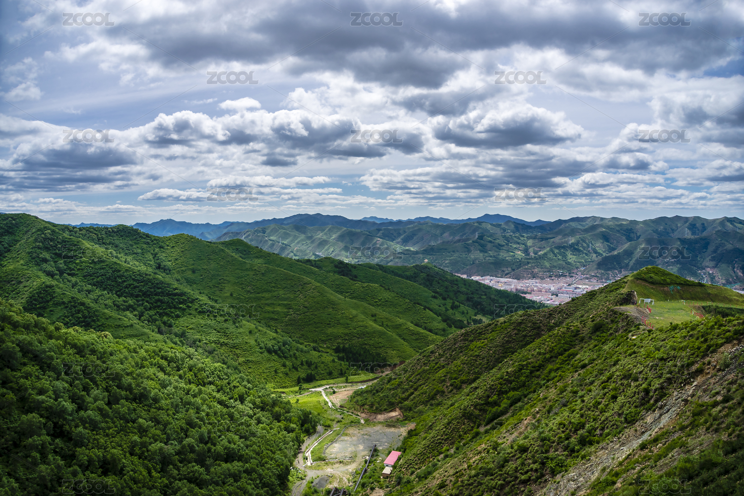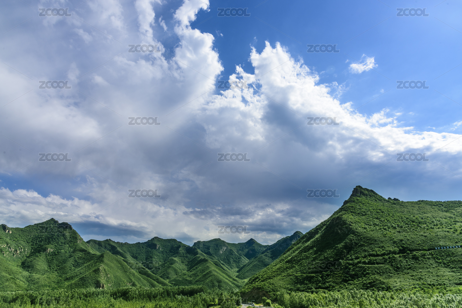 河北崇礼蓝天白云天空下夏季绿色山谷风光
