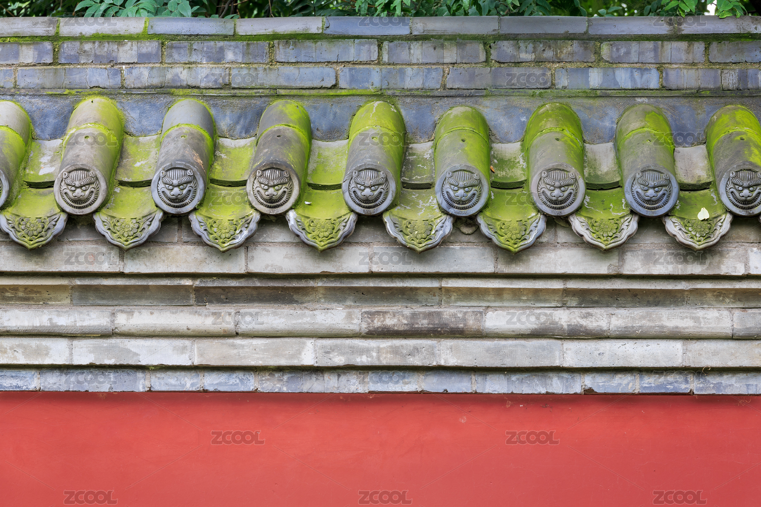 布满苔藓的灰色瓦当红色墙面的中式传统寺庙围墙