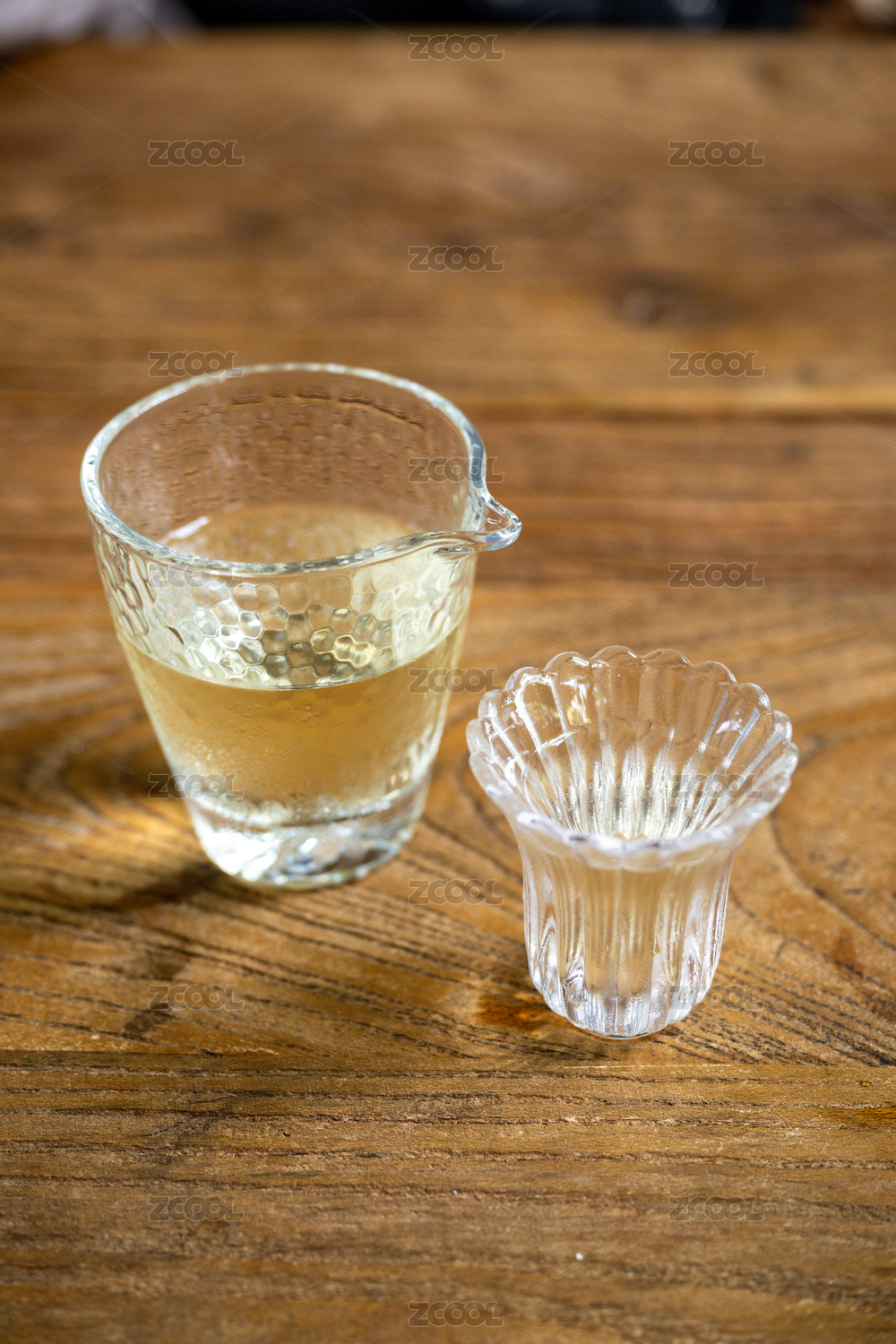 木桌上摆放的玻璃量杯与小杯