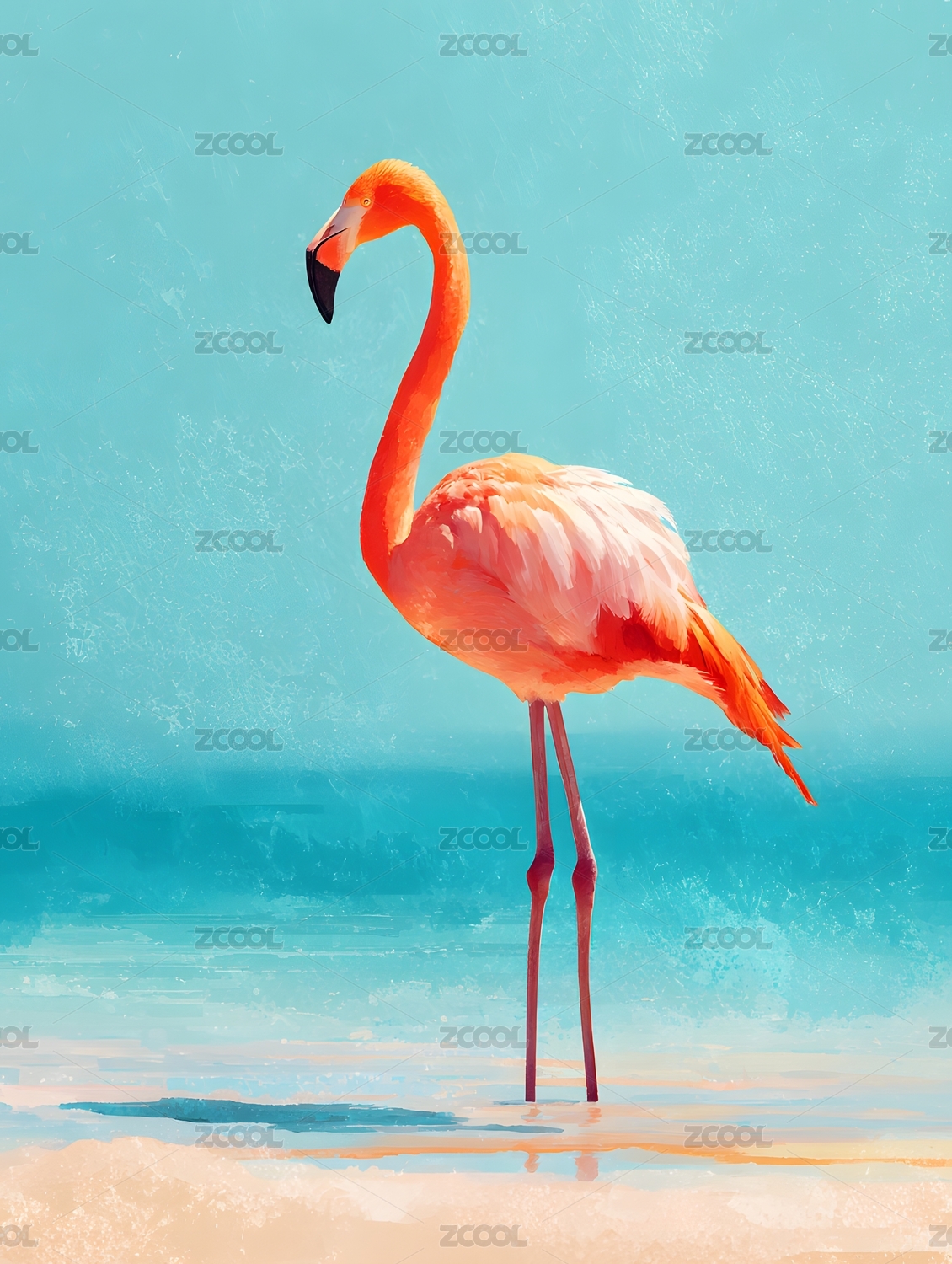 炎热的夏天,火烈鸟在美丽沙滩上散步,海浪不断地拍打海滩上的细沙插画背景海报