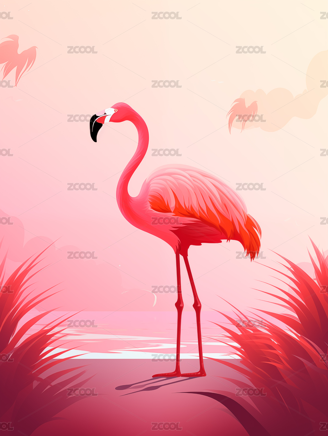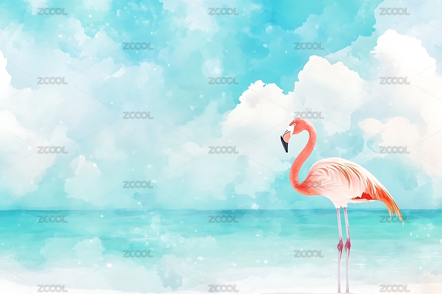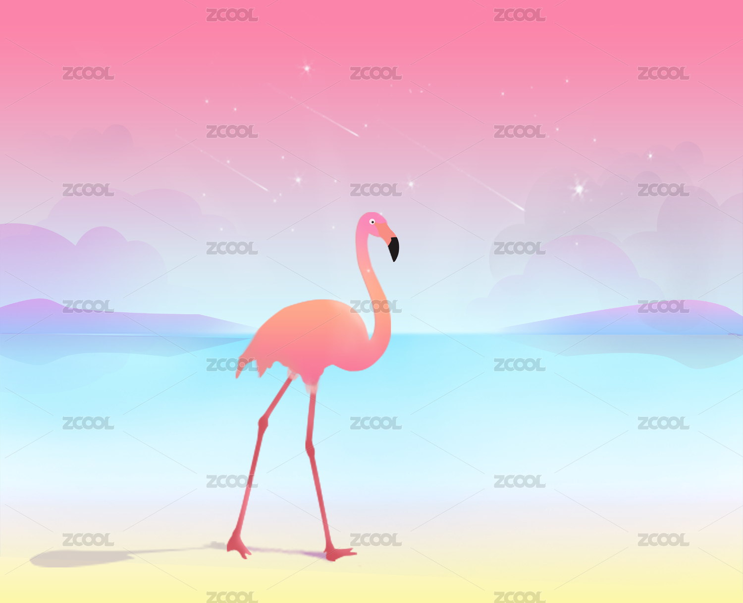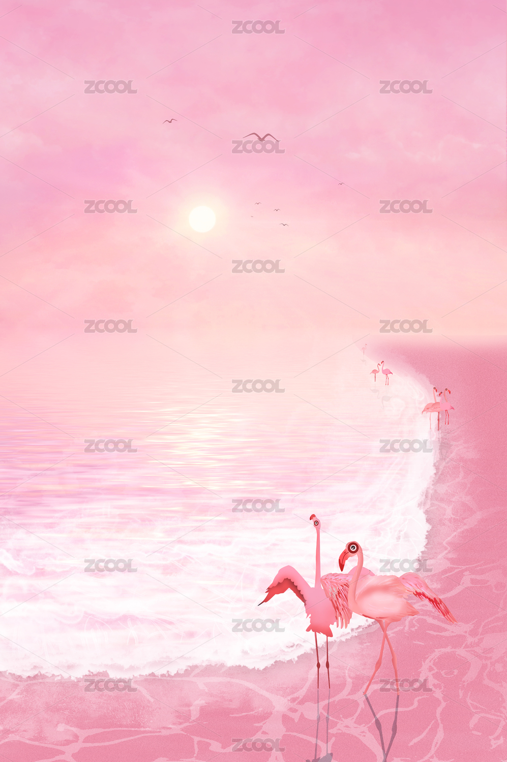 炎热的夏天,火烈鸟在美丽沙滩上散步,海浪不断地拍打海滩上的细沙插画背景海报