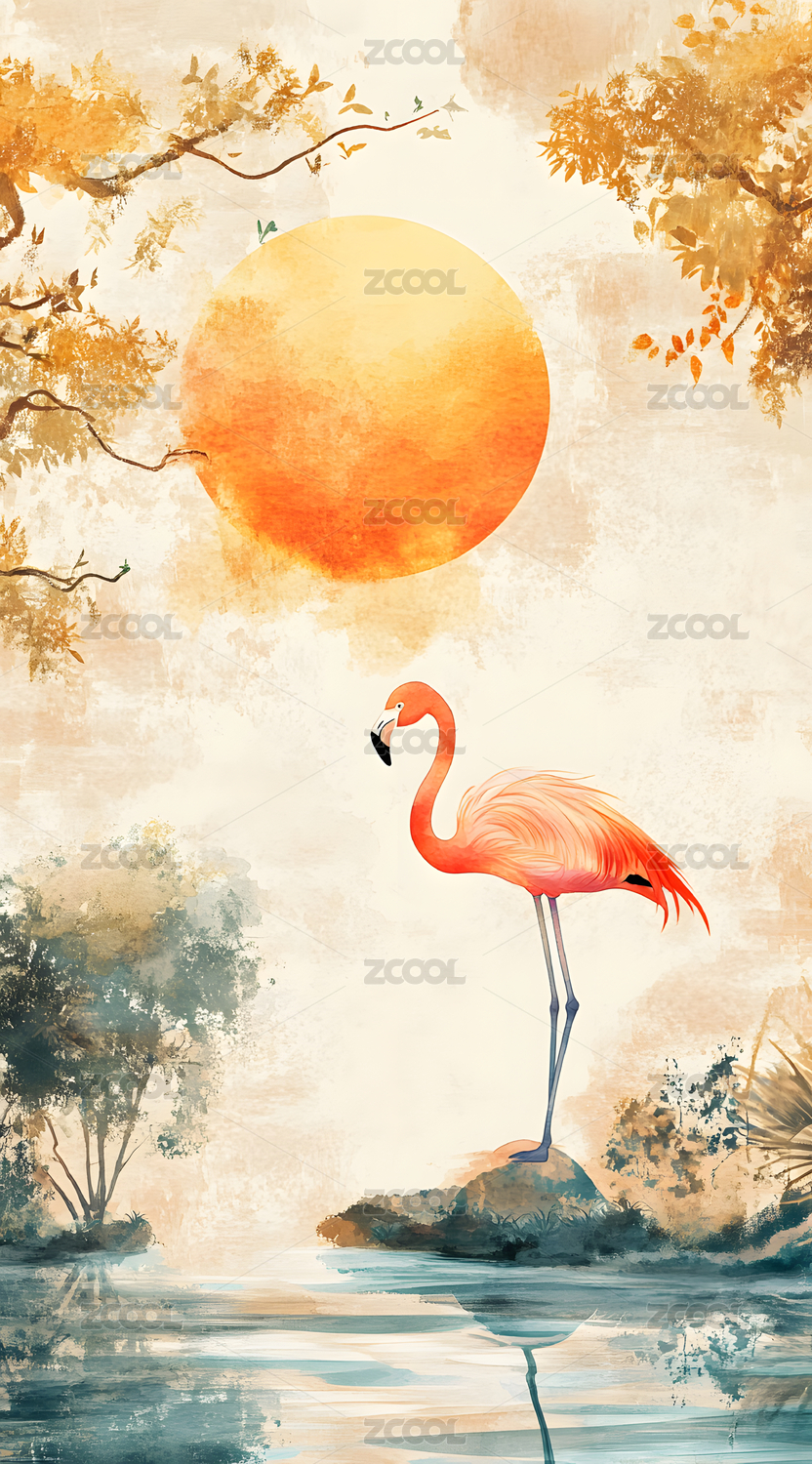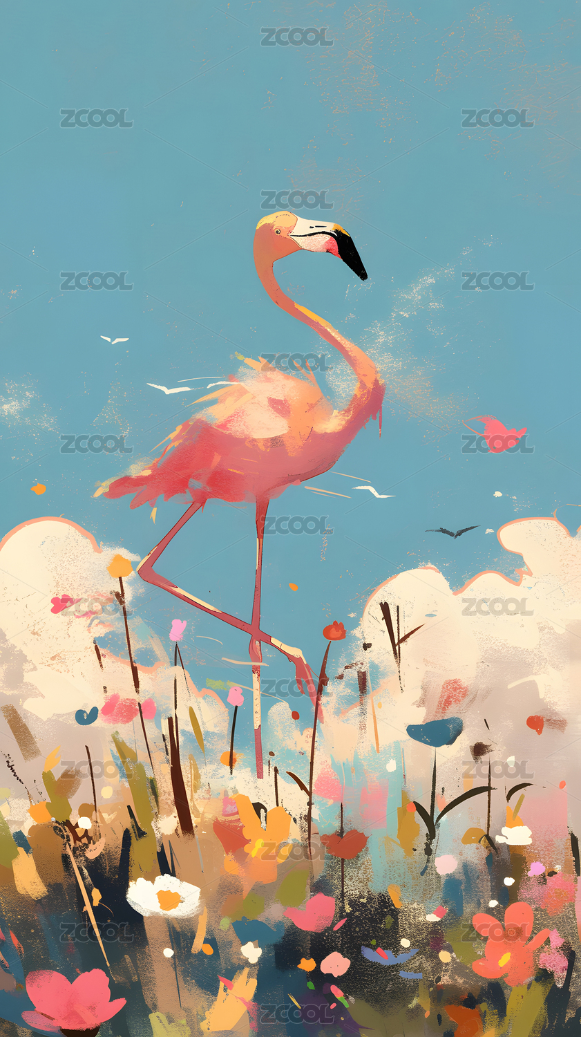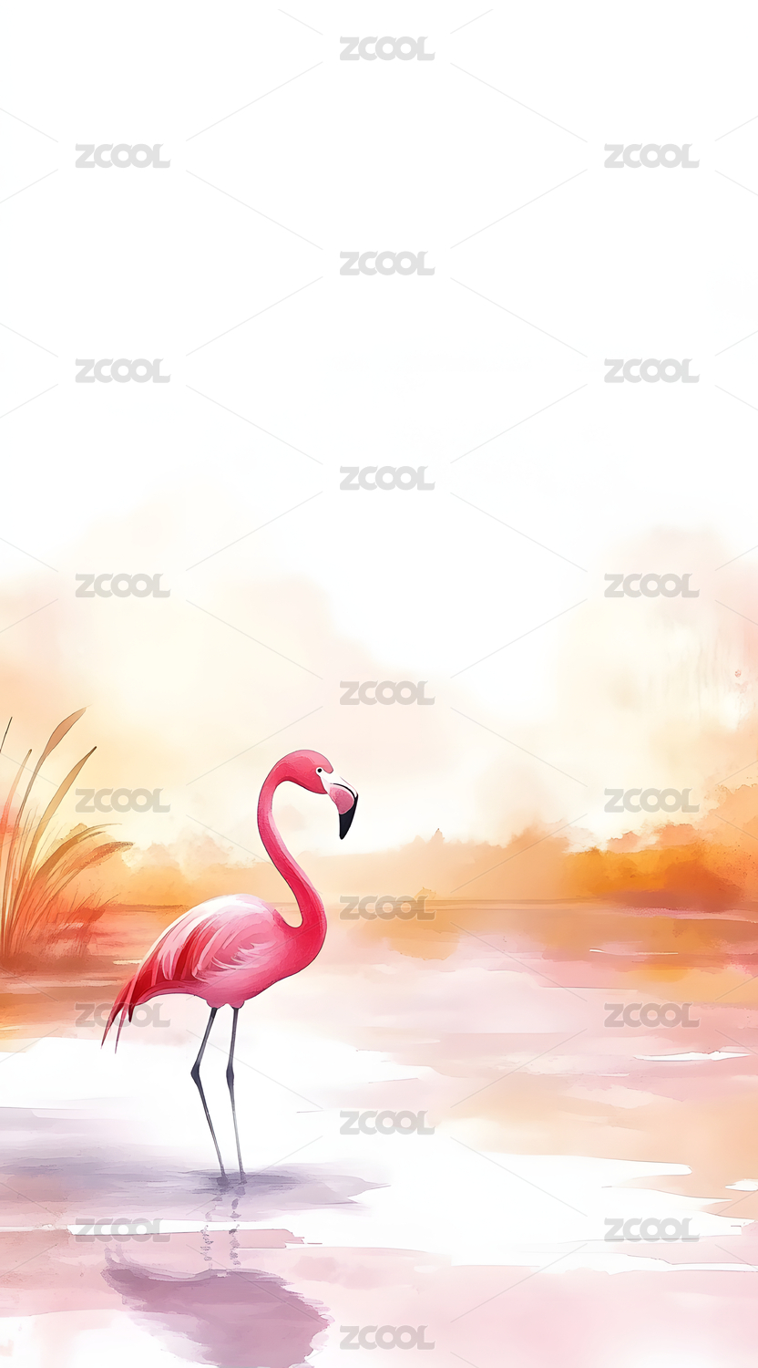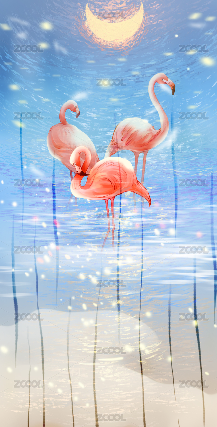 炎热的夏天,火烈鸟在美丽沙滩上散步,海浪不断地拍打海滩上的细沙插画背景海报
