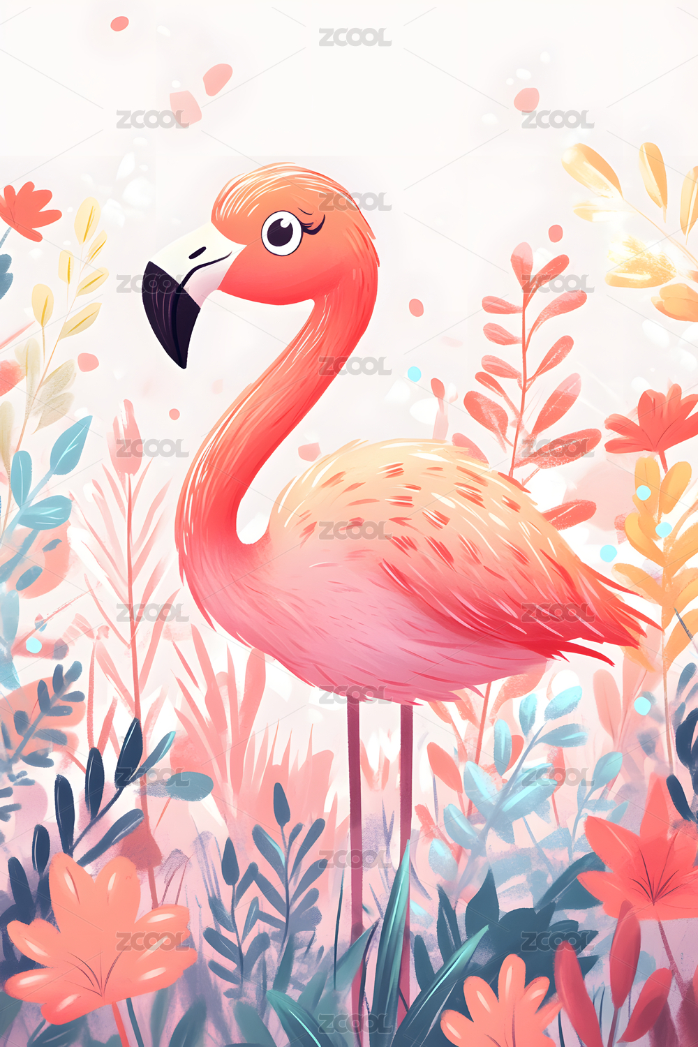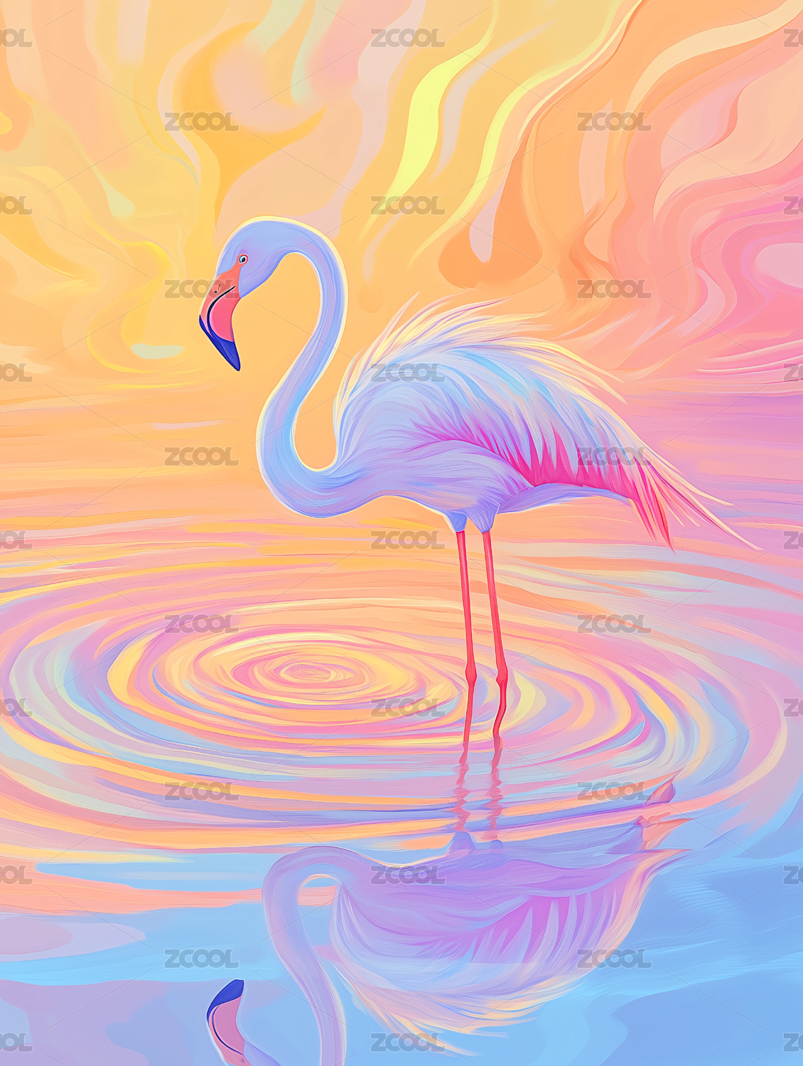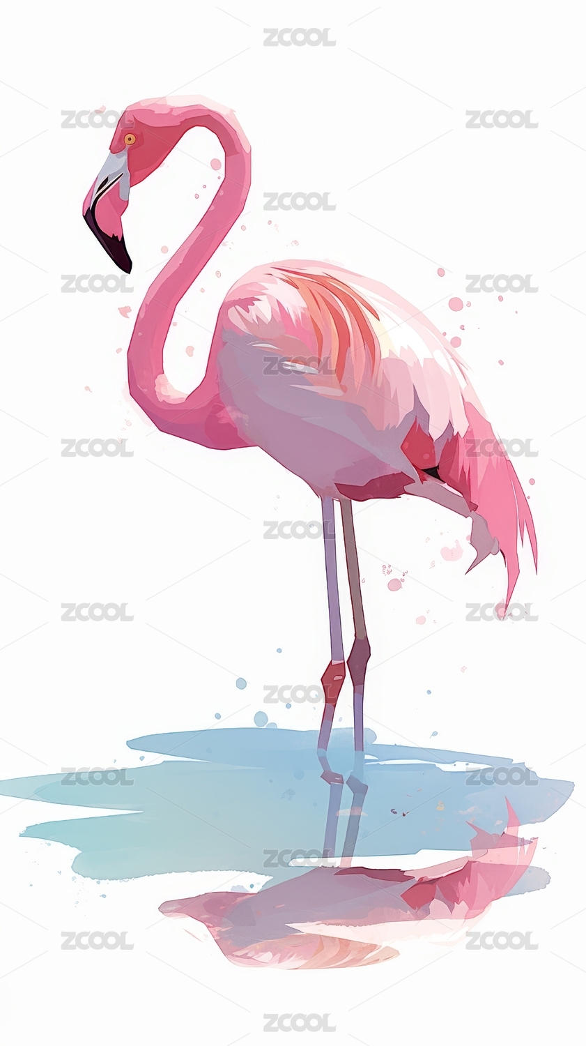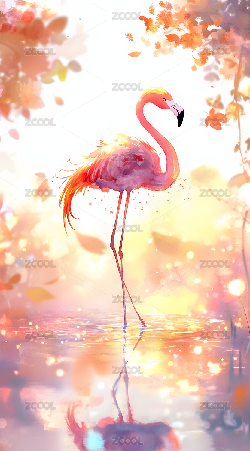 炎热的夏天,火烈鸟在美丽沙滩上散步,海浪不断地拍打海滩上的细沙插画背景海报