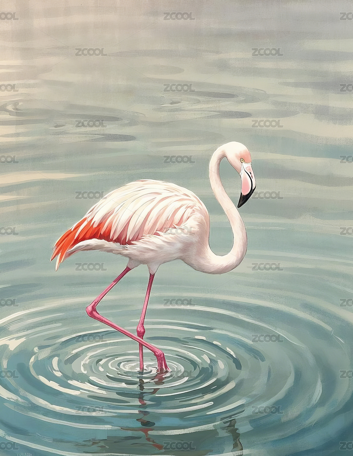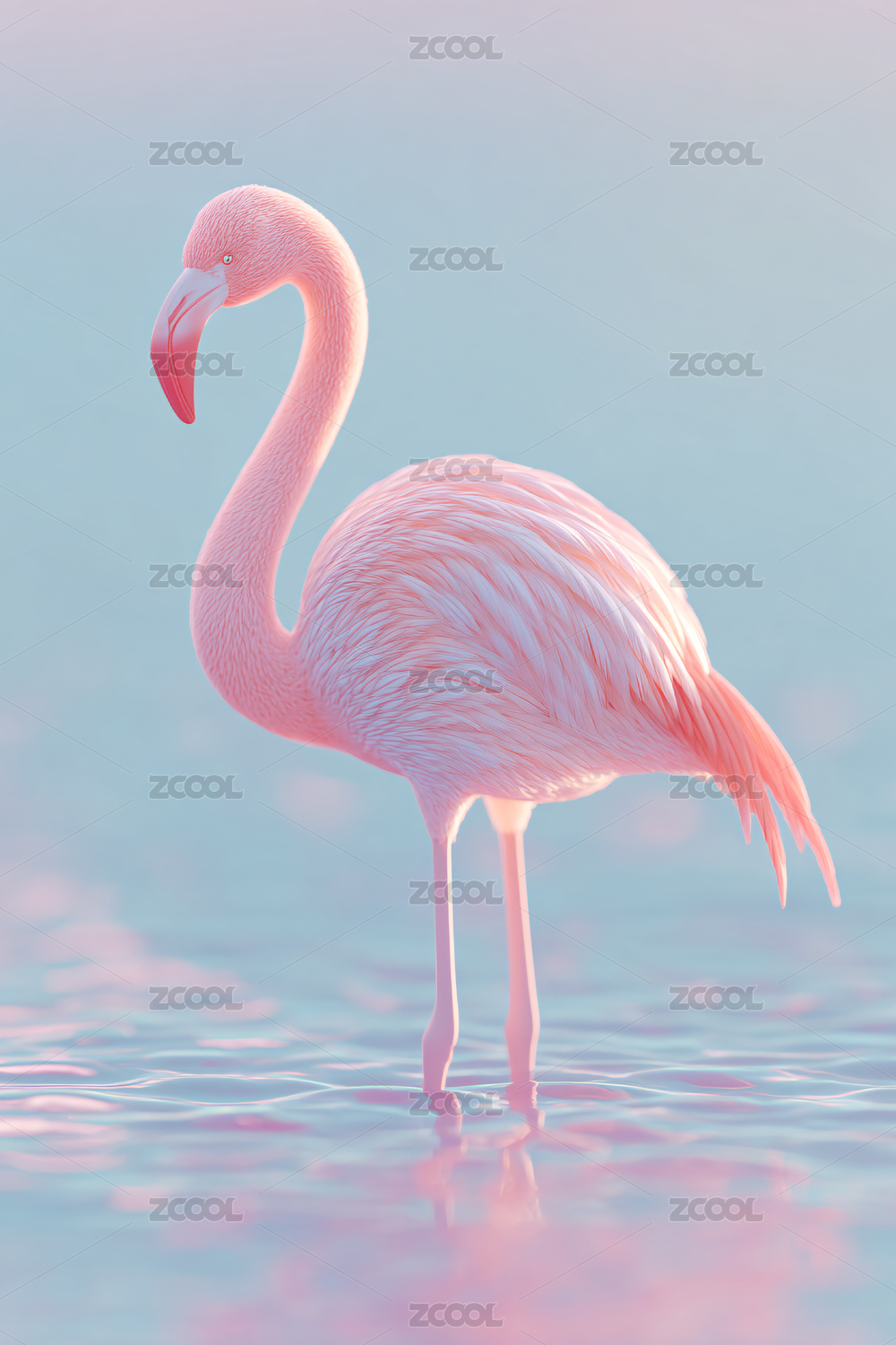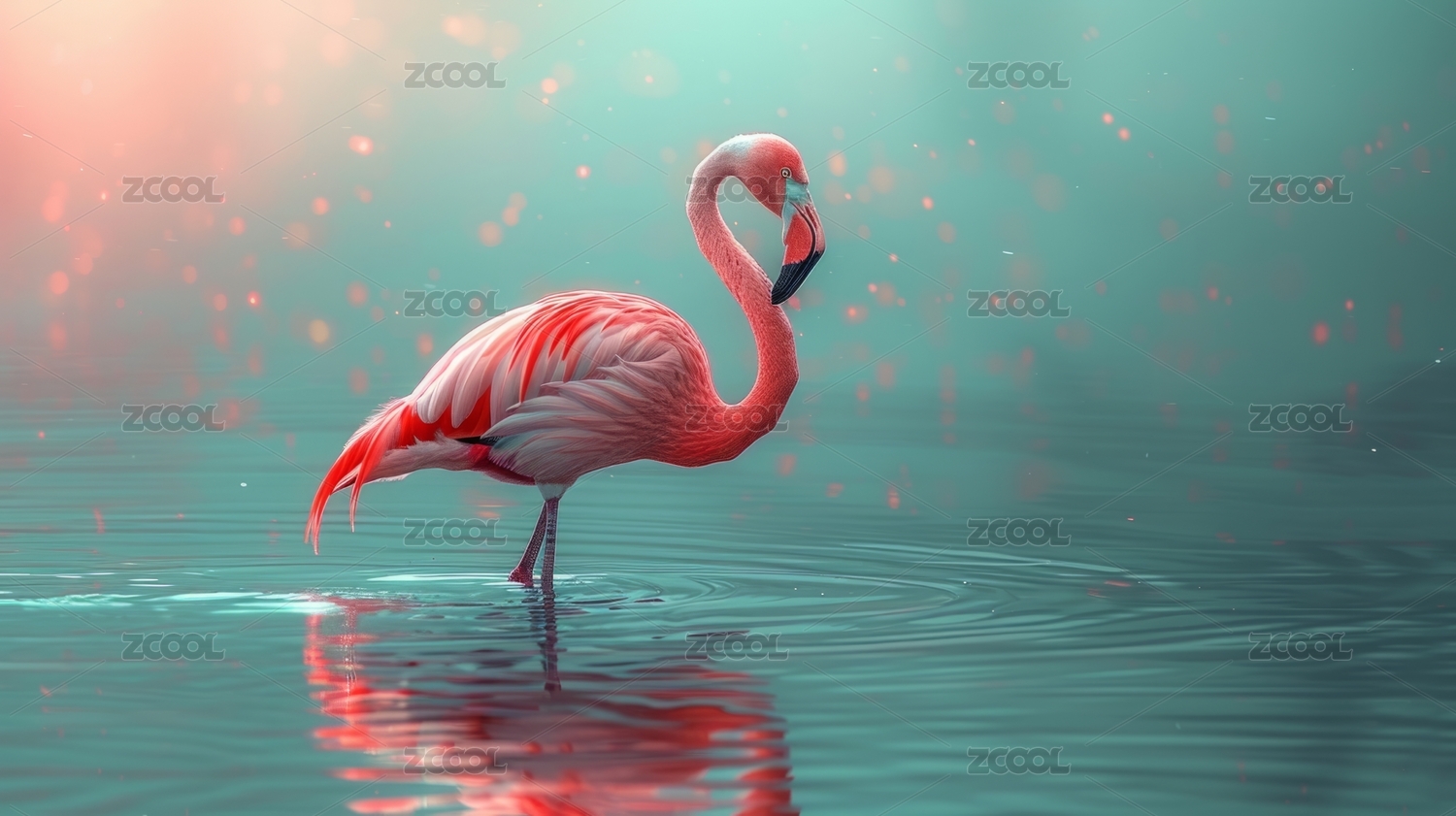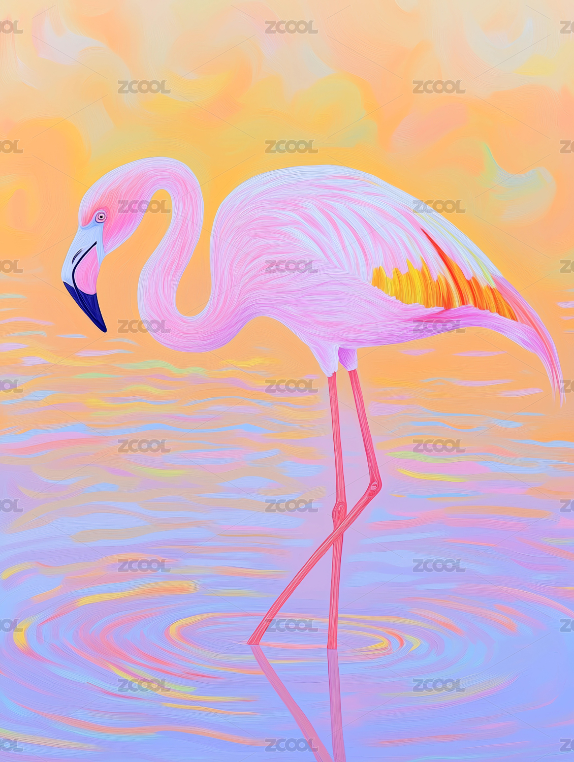炎热的夏天,火烈鸟在美丽沙滩上散步,海浪不断地拍打海滩上的细沙插画背景海报