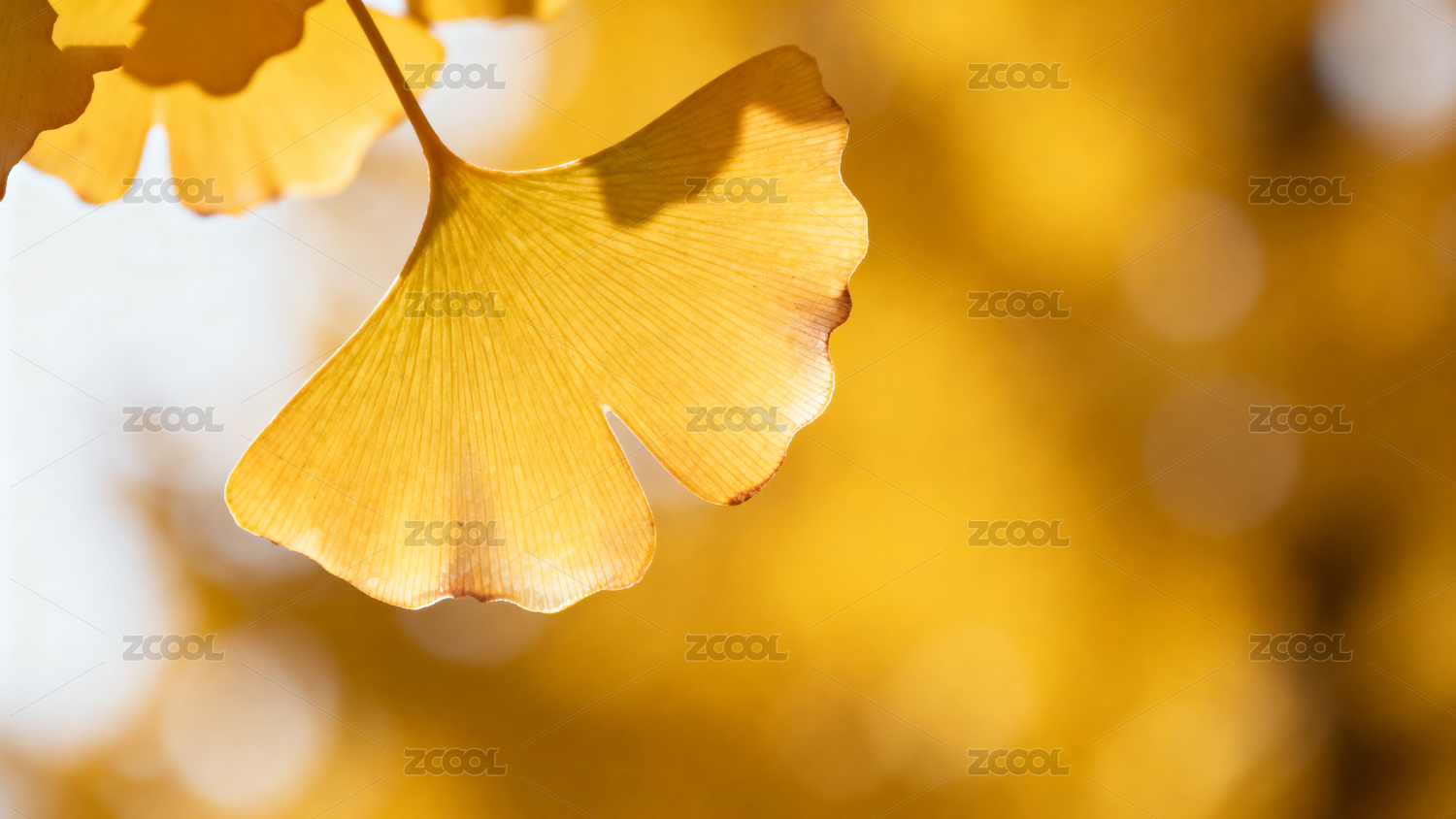 侧逆光条件下一枝金黄色的银杏叶片特写图