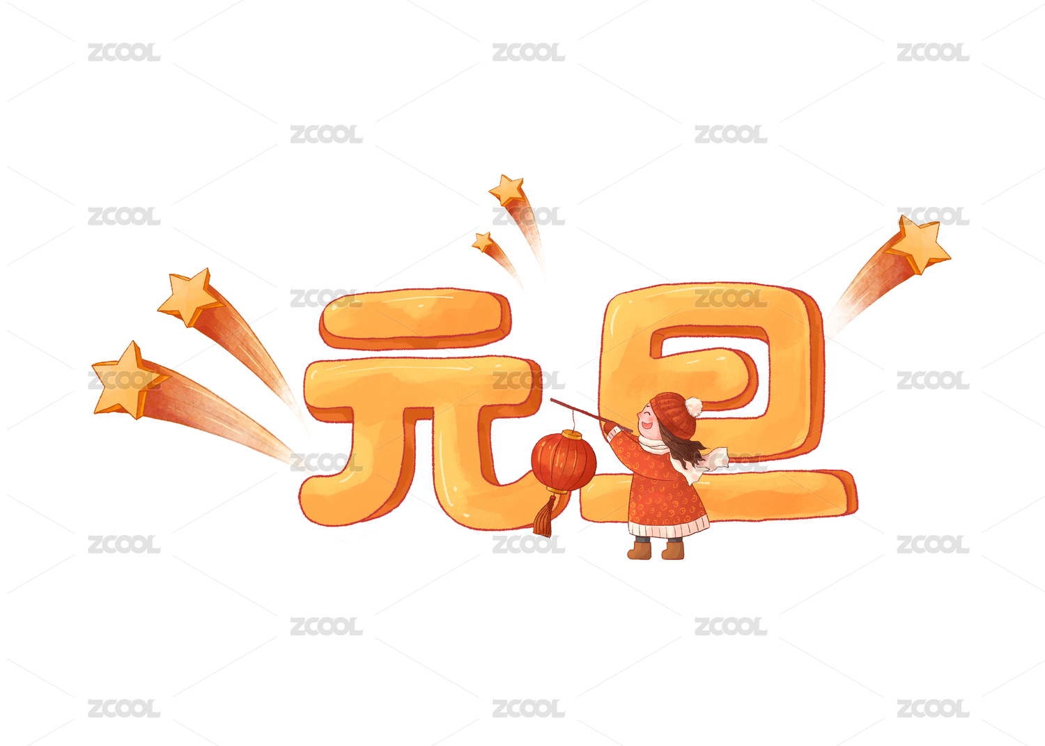 金色元旦字形与星星前手拿灯笼的女孩新年插画图素