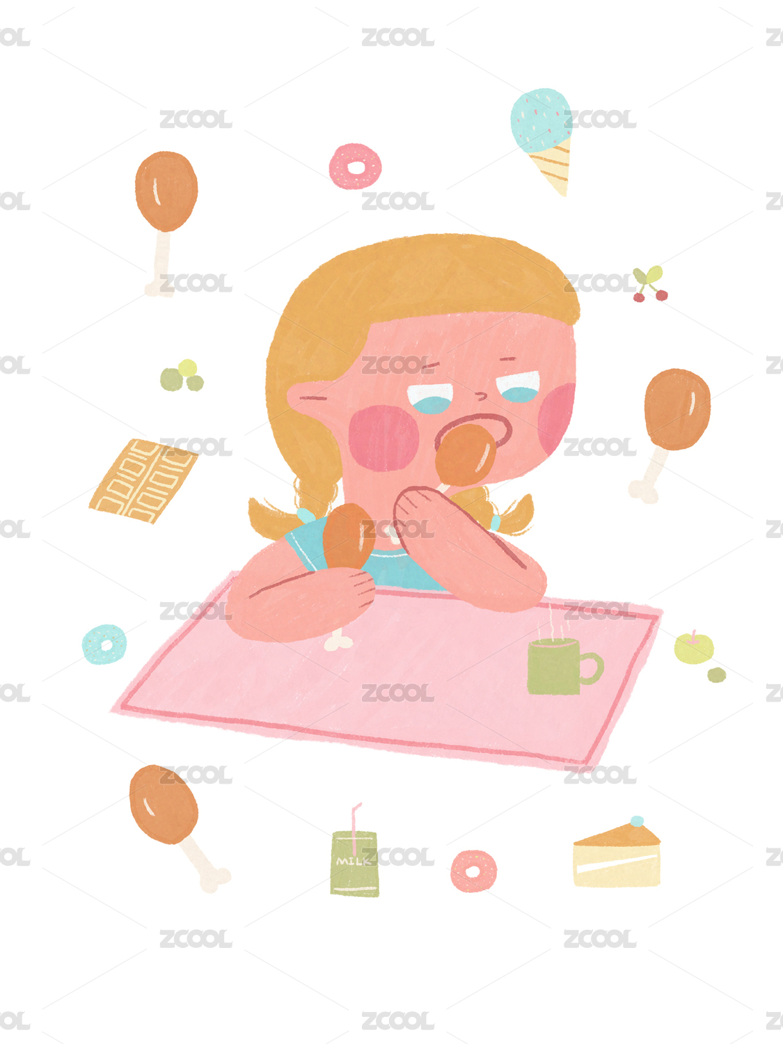 一个吃货女孩子和食物插画
