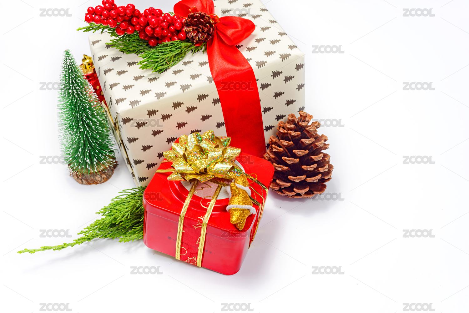 圣诞礼盒和圣诞节装饰品在白色背景上