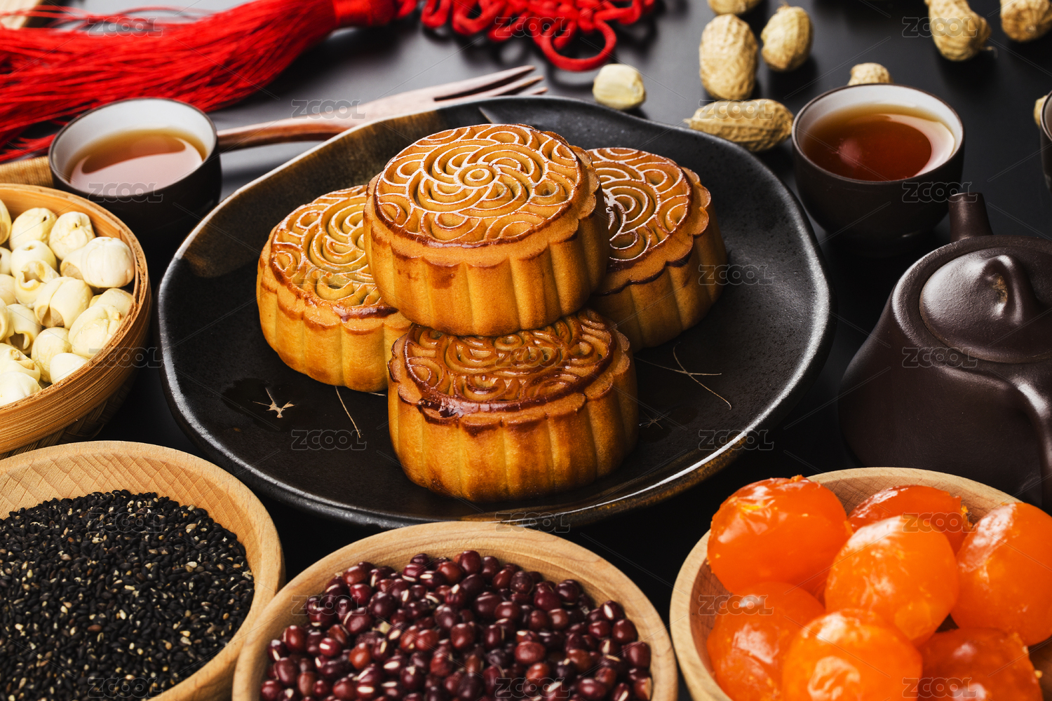 黑色背景上的中秋节小吃月饼