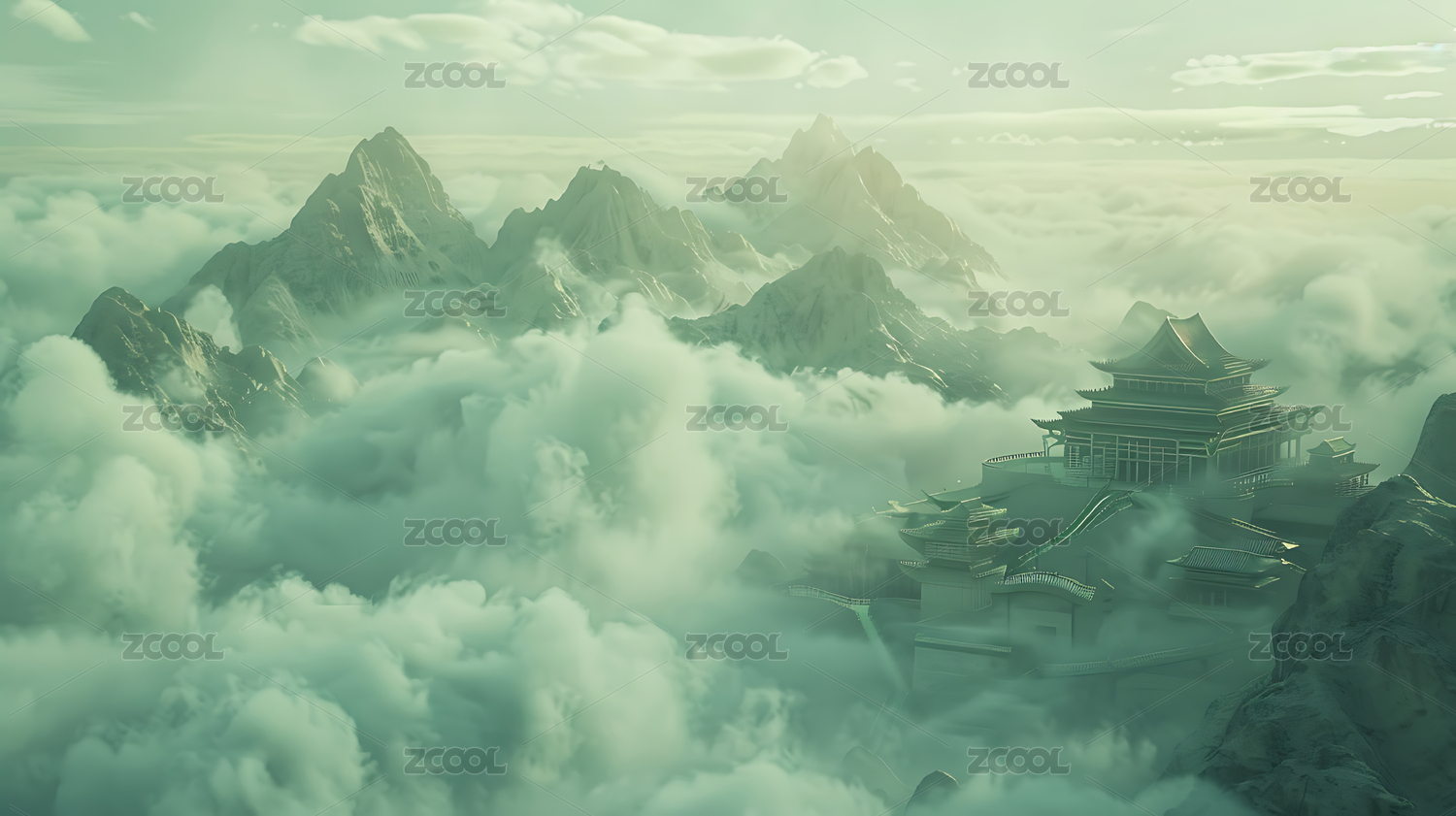 AIGC202407,古代建筑,云雾,山脉,空场景,壁纸,风景,山水,国风,3d