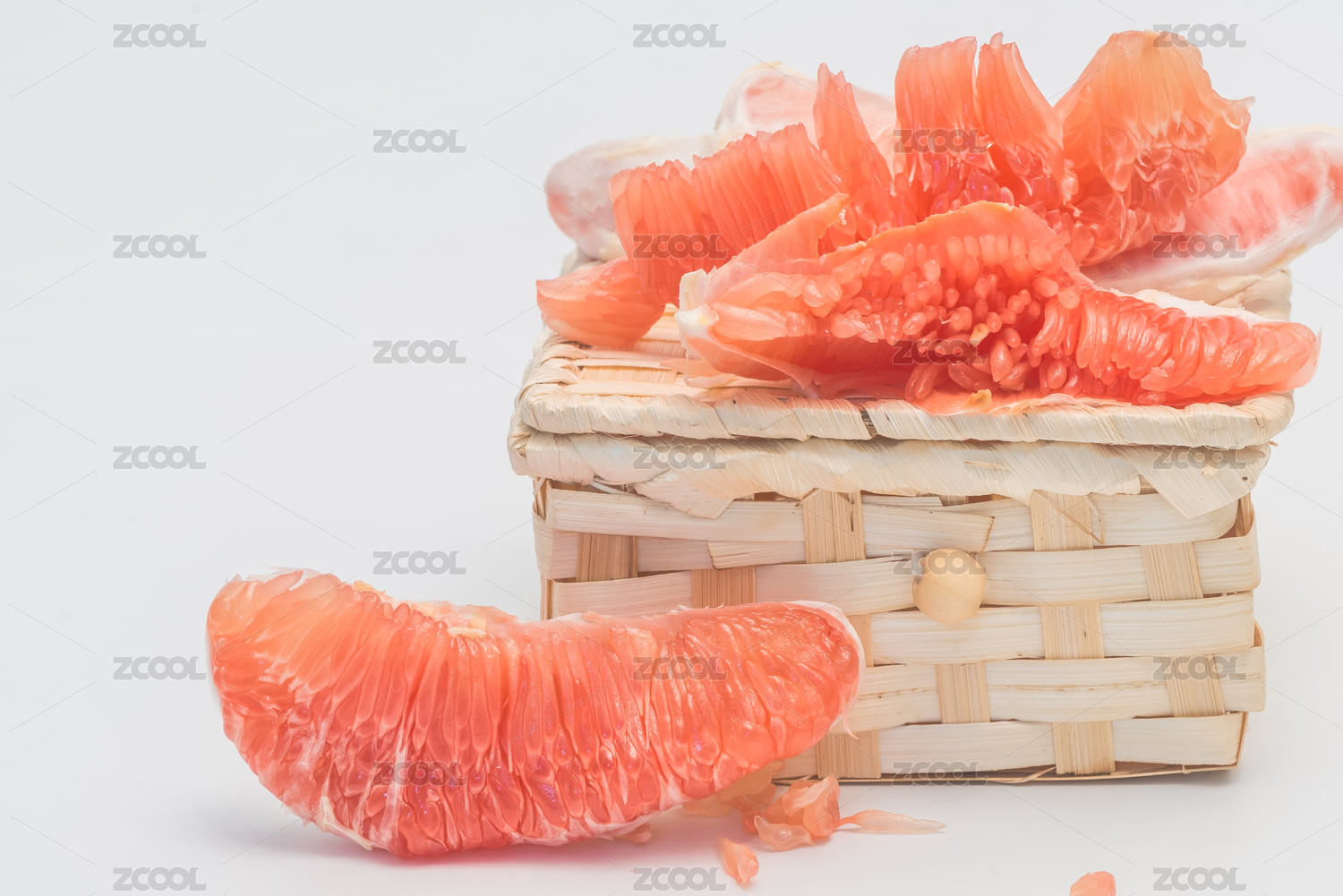 红肉柚子的果肉和竹篮在白色背景