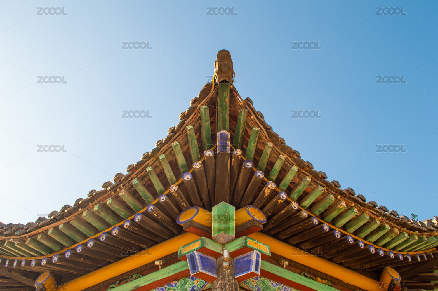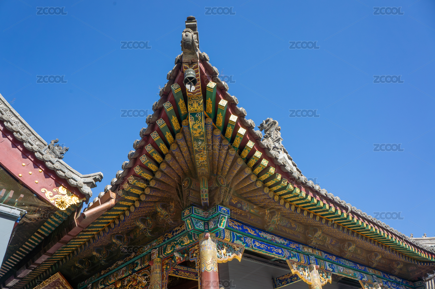 蓝天白云下大殿飞檐翘角,中国山东省寿光市宁国寺