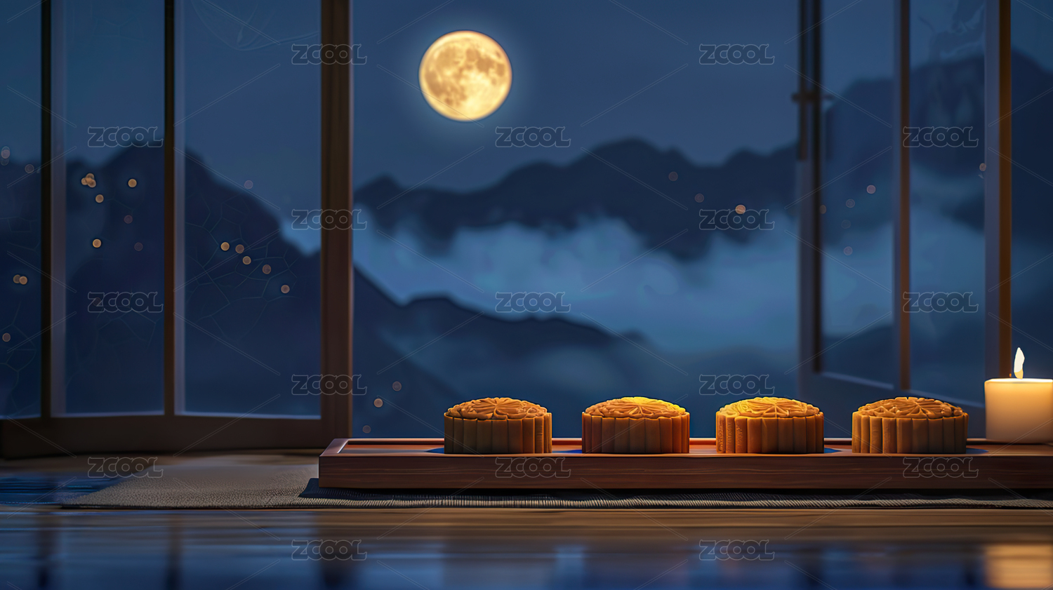 中秋月圆唯美夜色窗边月饼中式糕点图