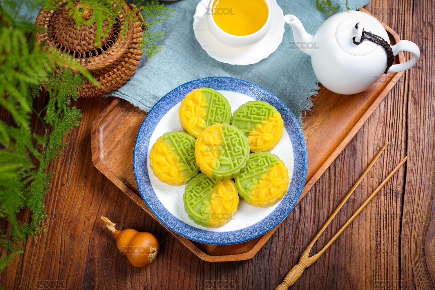 中式竹帘上的中秋节美食月饼