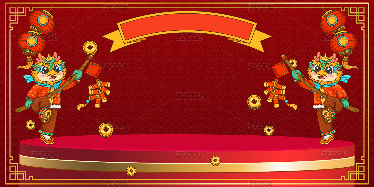 龙年矢量灯笼开门红喷钱枪荷花中国红背景墙