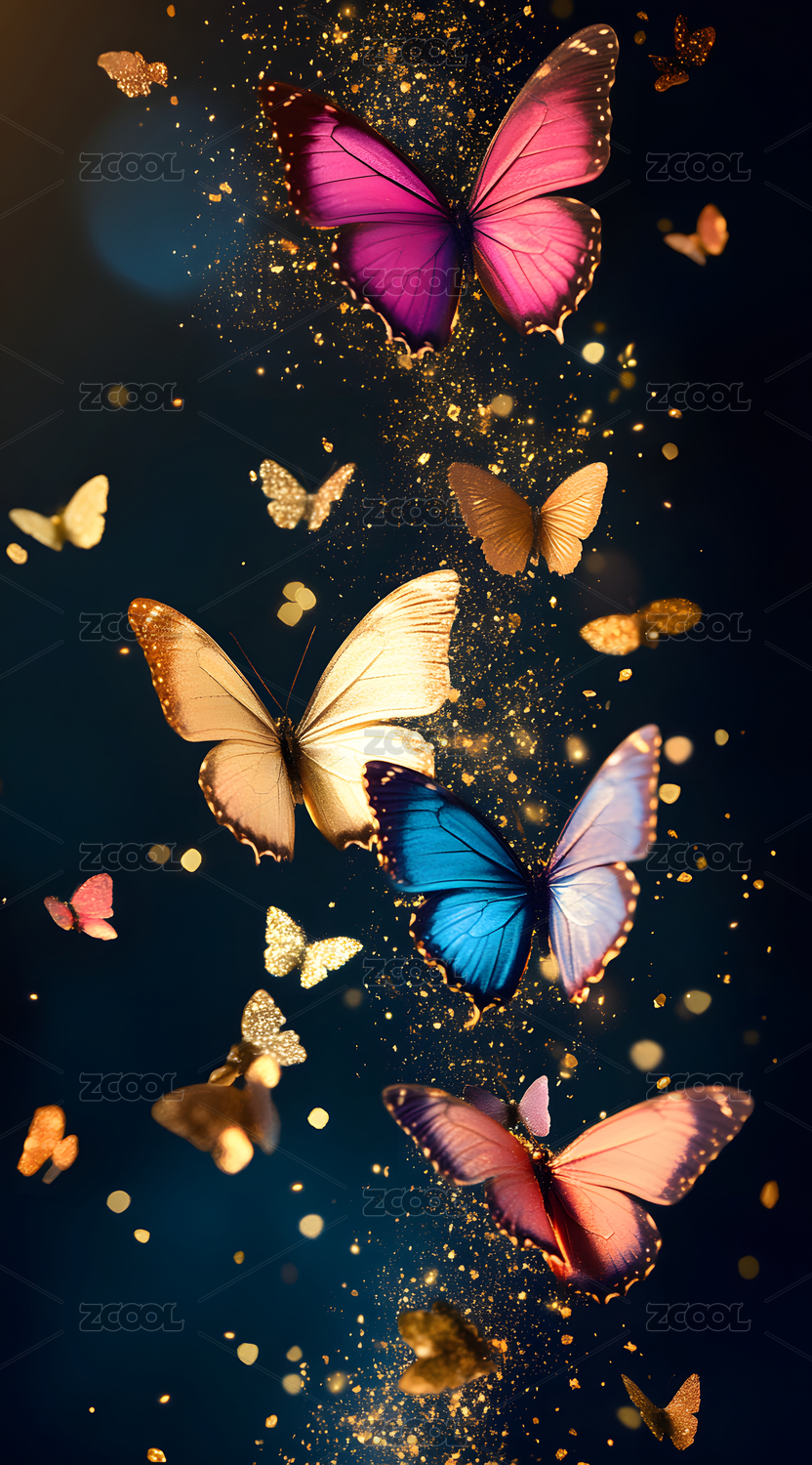 梦幻飞舞煽动翅膀的彩色蝴蝶印花图案