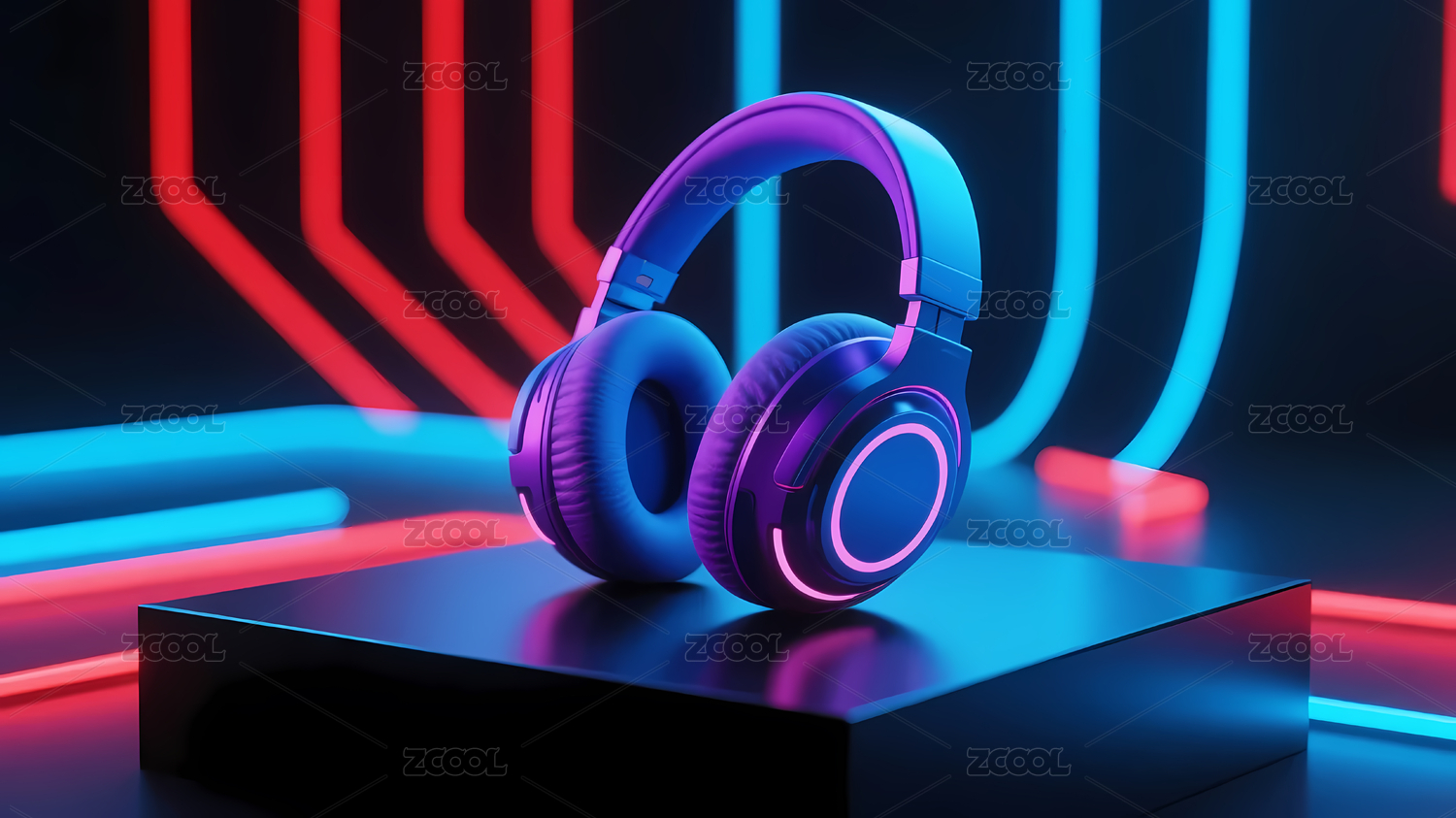 炫彩耳机静置于蓝色平台