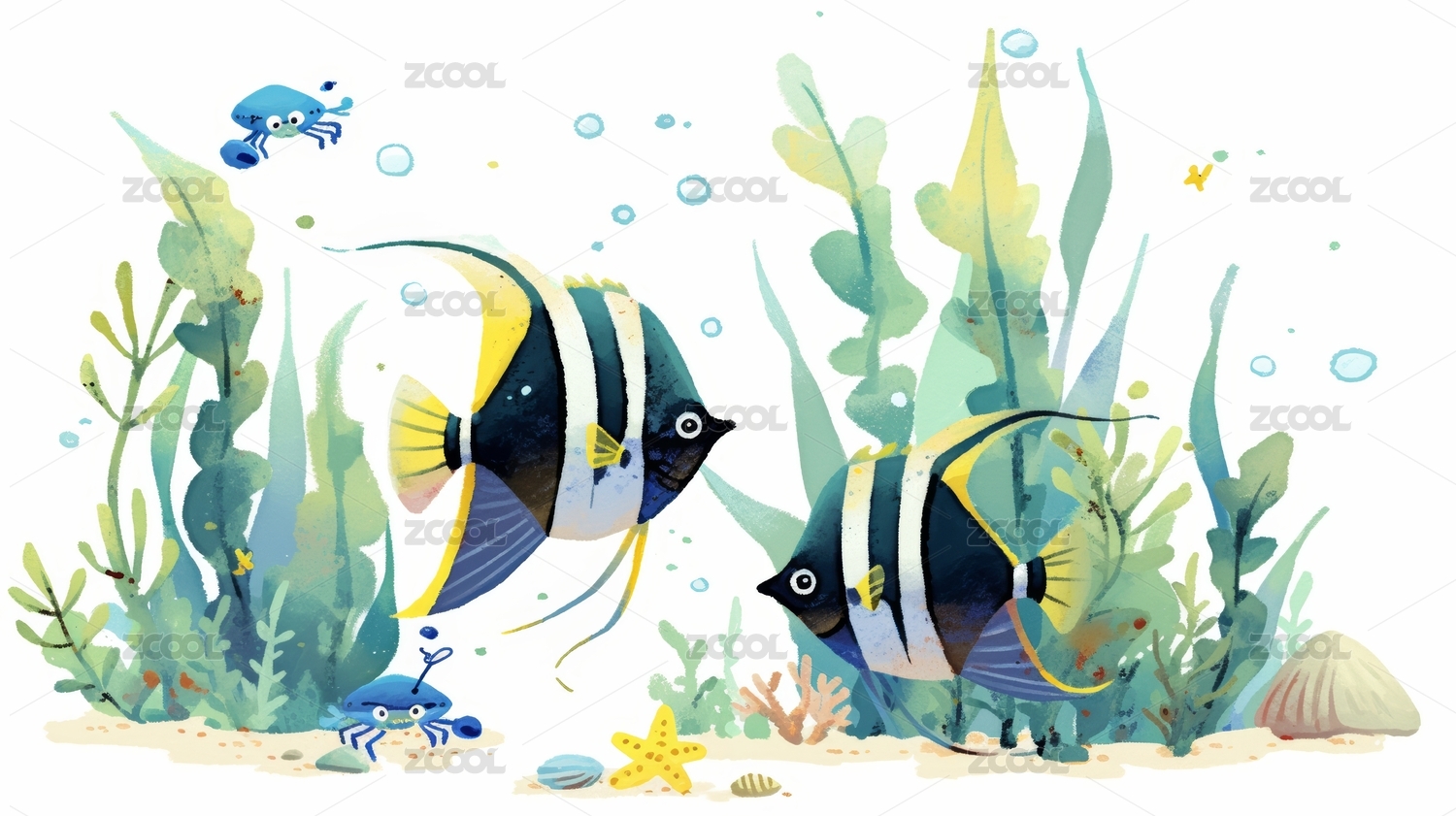 鱼儿,海星,海草,深海,植物,水底,卡通,清凉,夏季,夏天