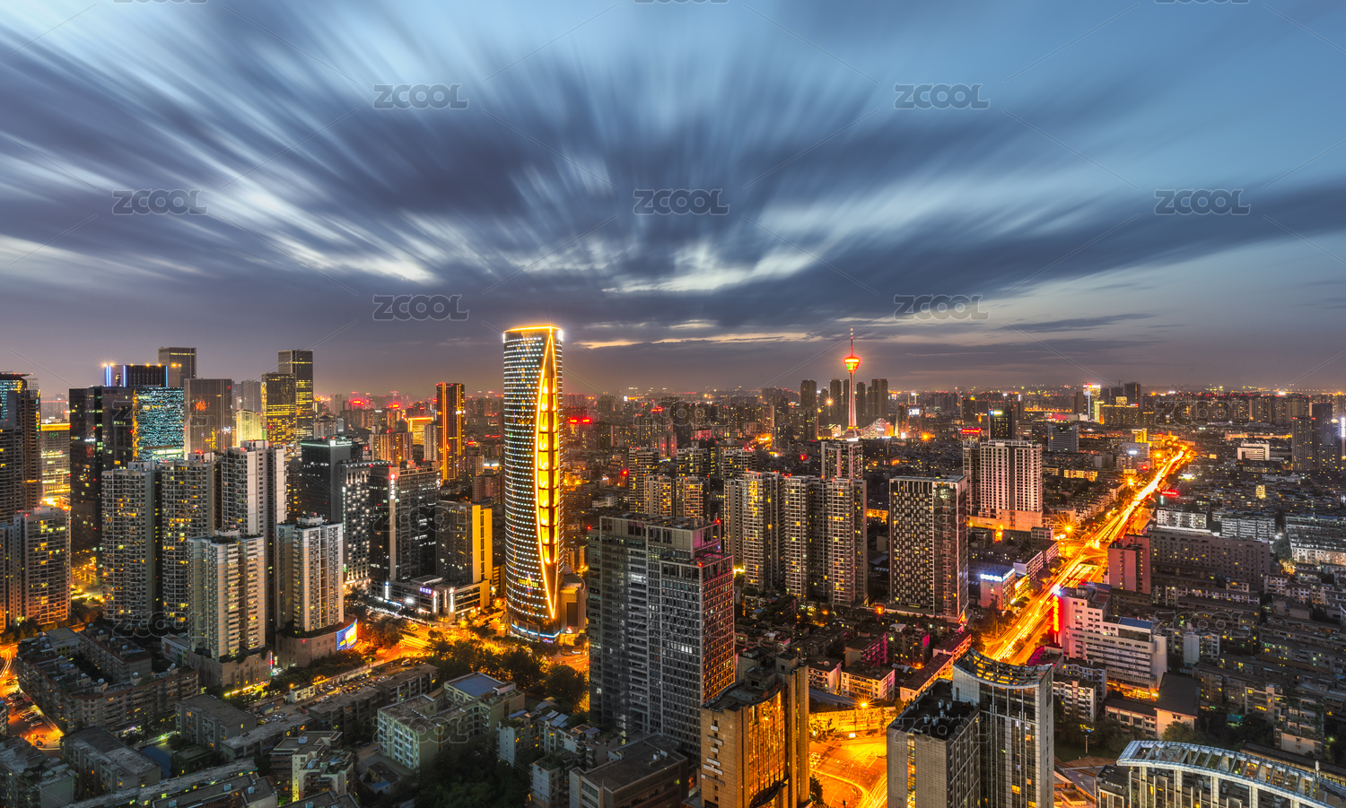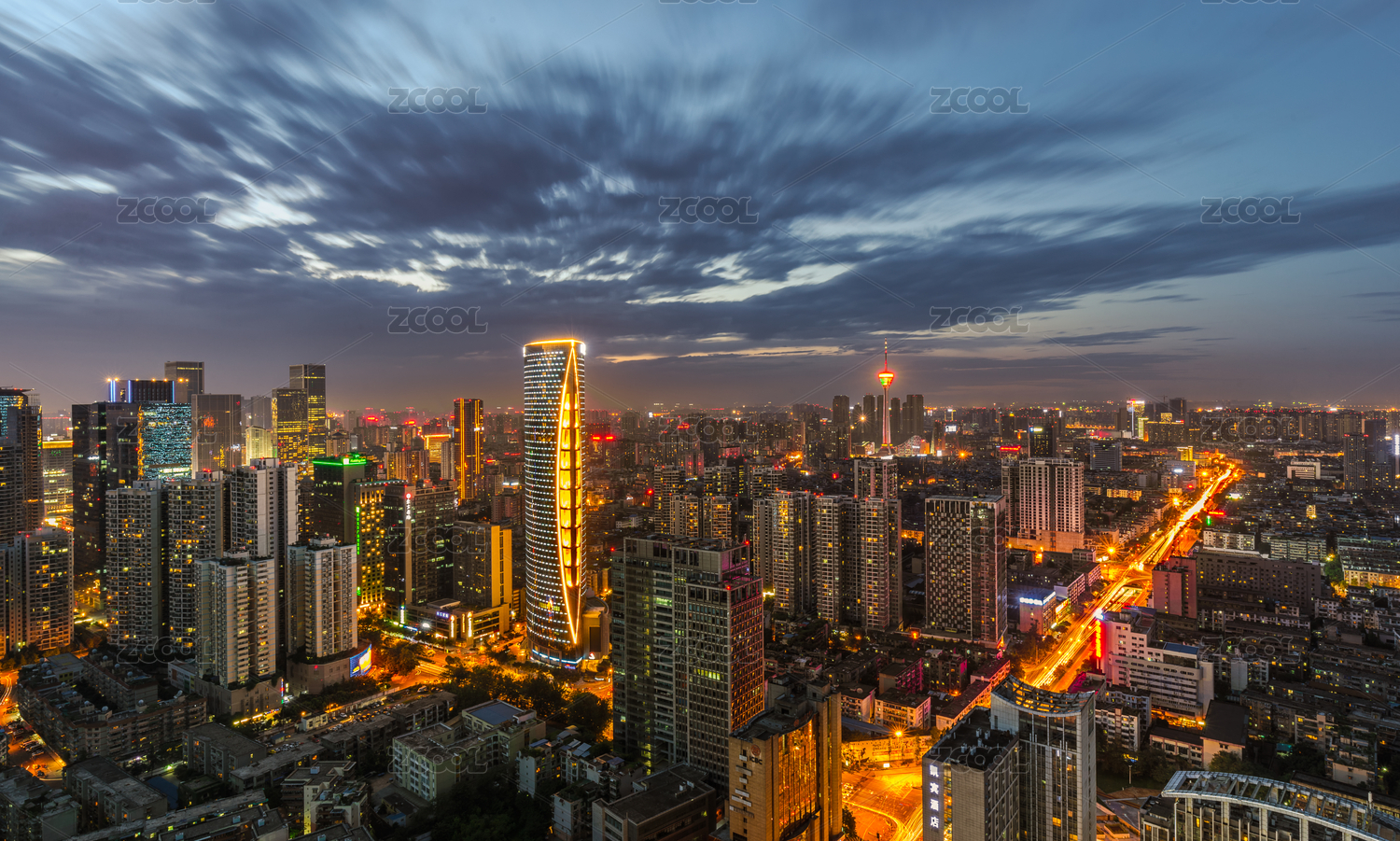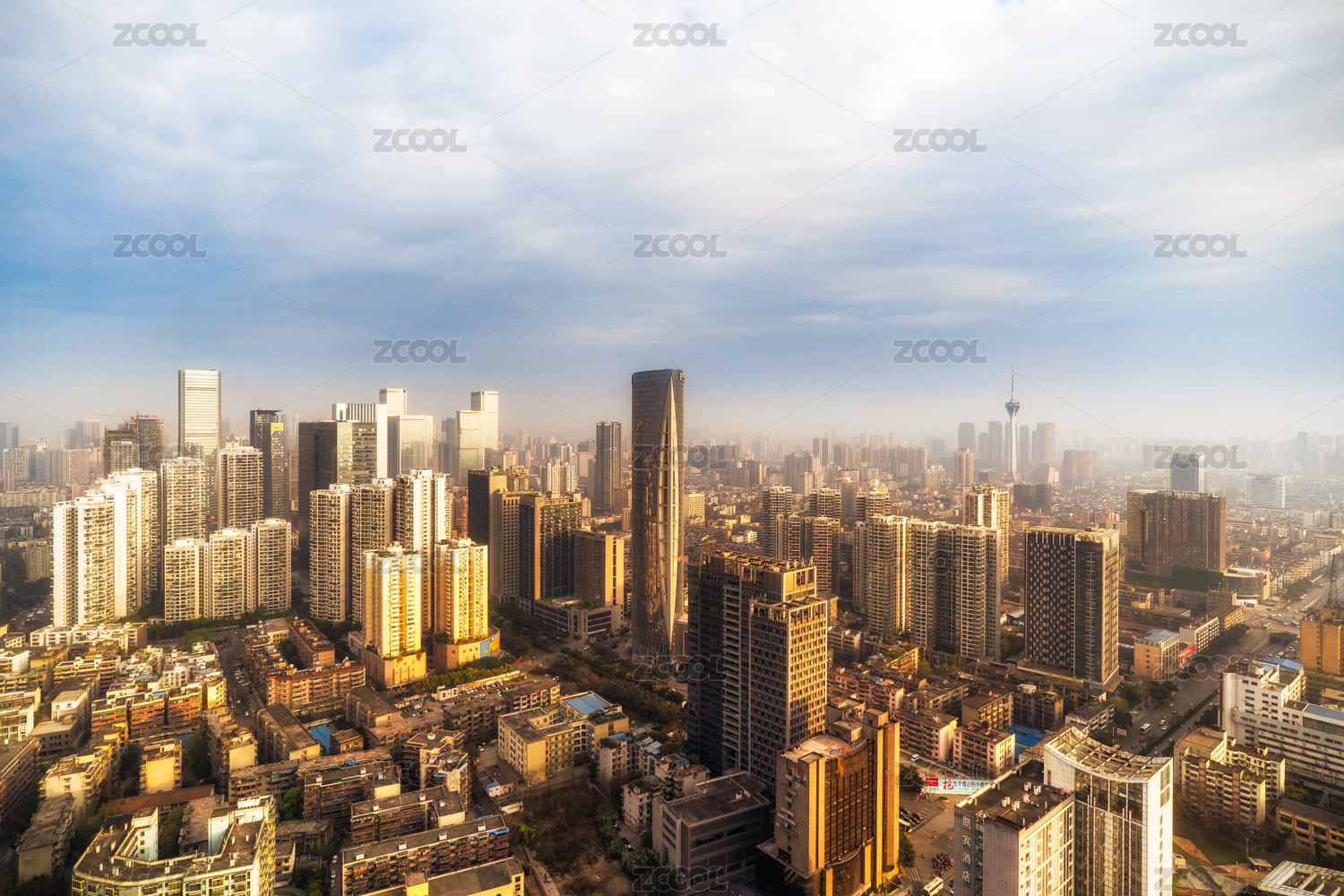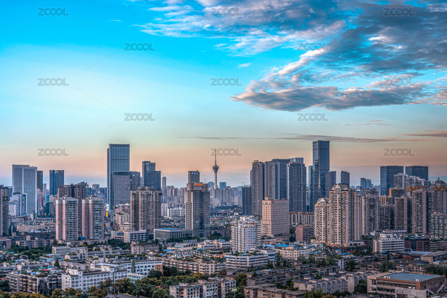 亚洲中国四川成都市中心建筑亮灯日落全景