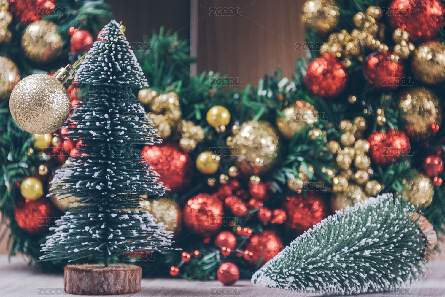 圣诞装饰品和绿色出现在木材。