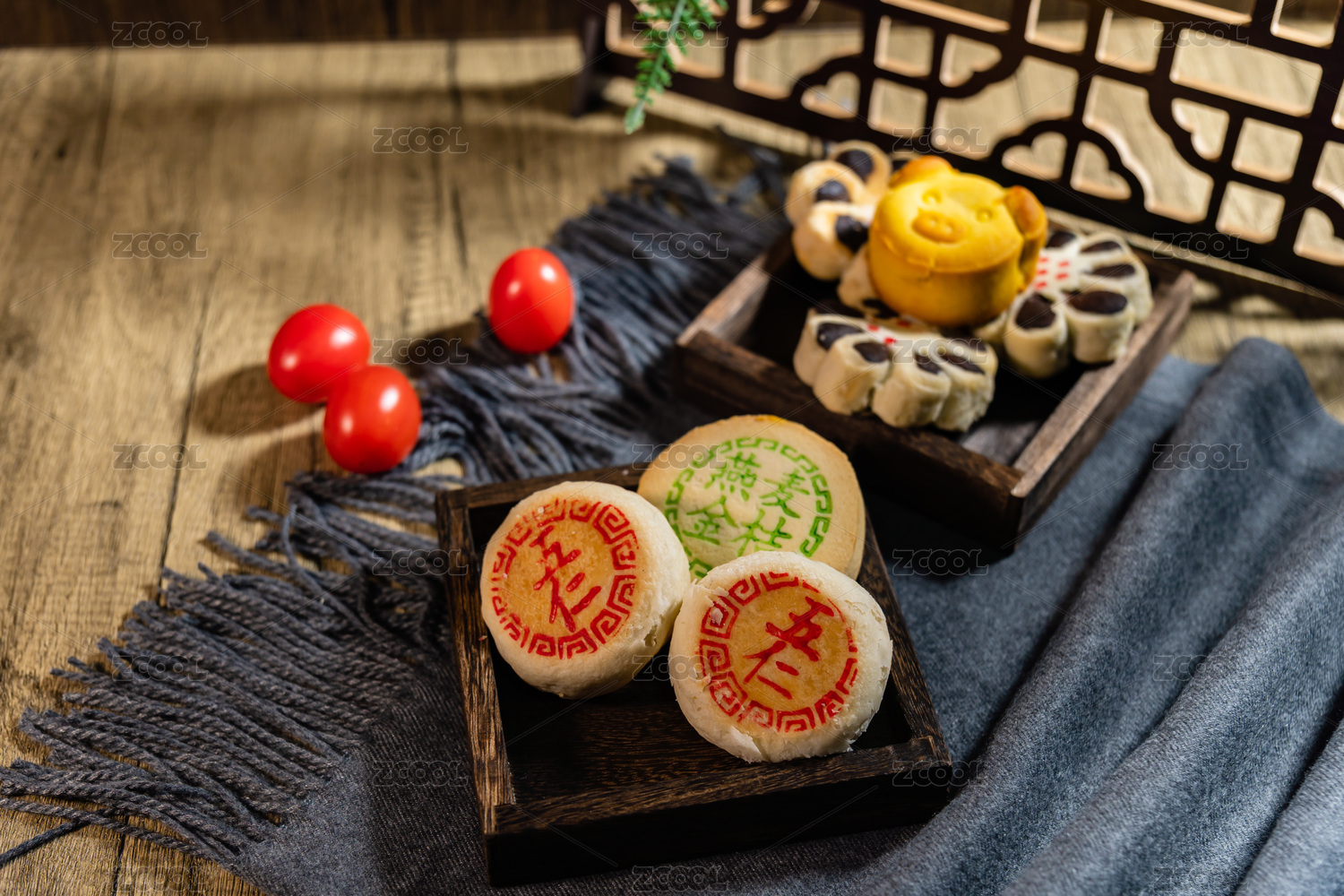 传统八件糕点白皮喜字饼摆放在桌面上特写