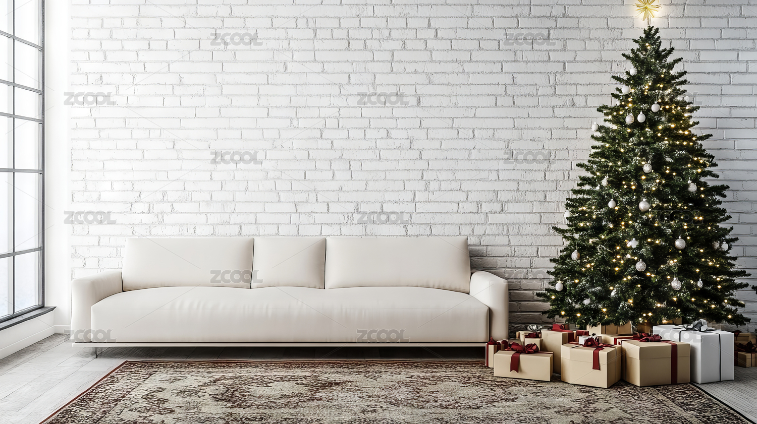 卧室,圣诞树,礼物盒,红色,白色,节日,温馨,床,砖墙,大窗户