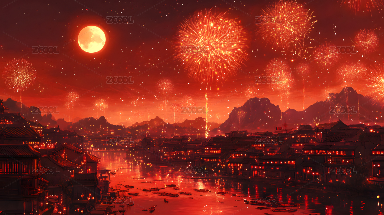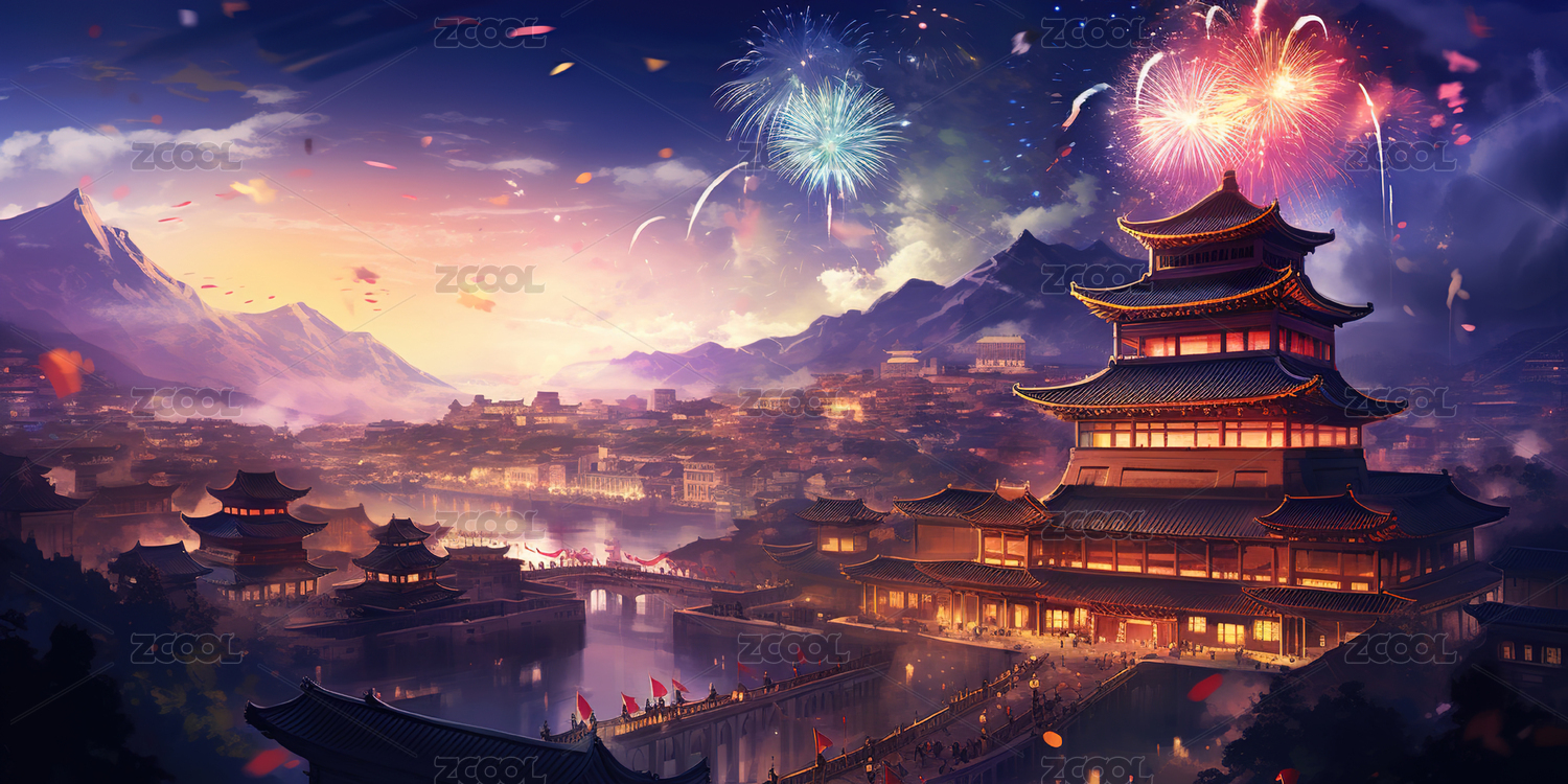 烟花国庆节春节新年中秋节节日卡通插画背景