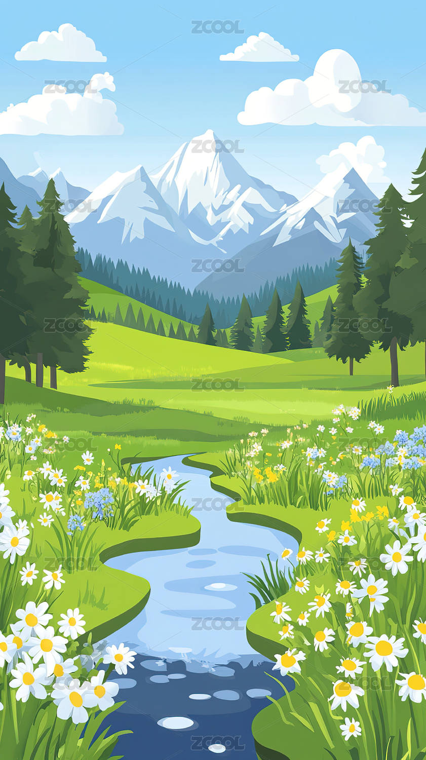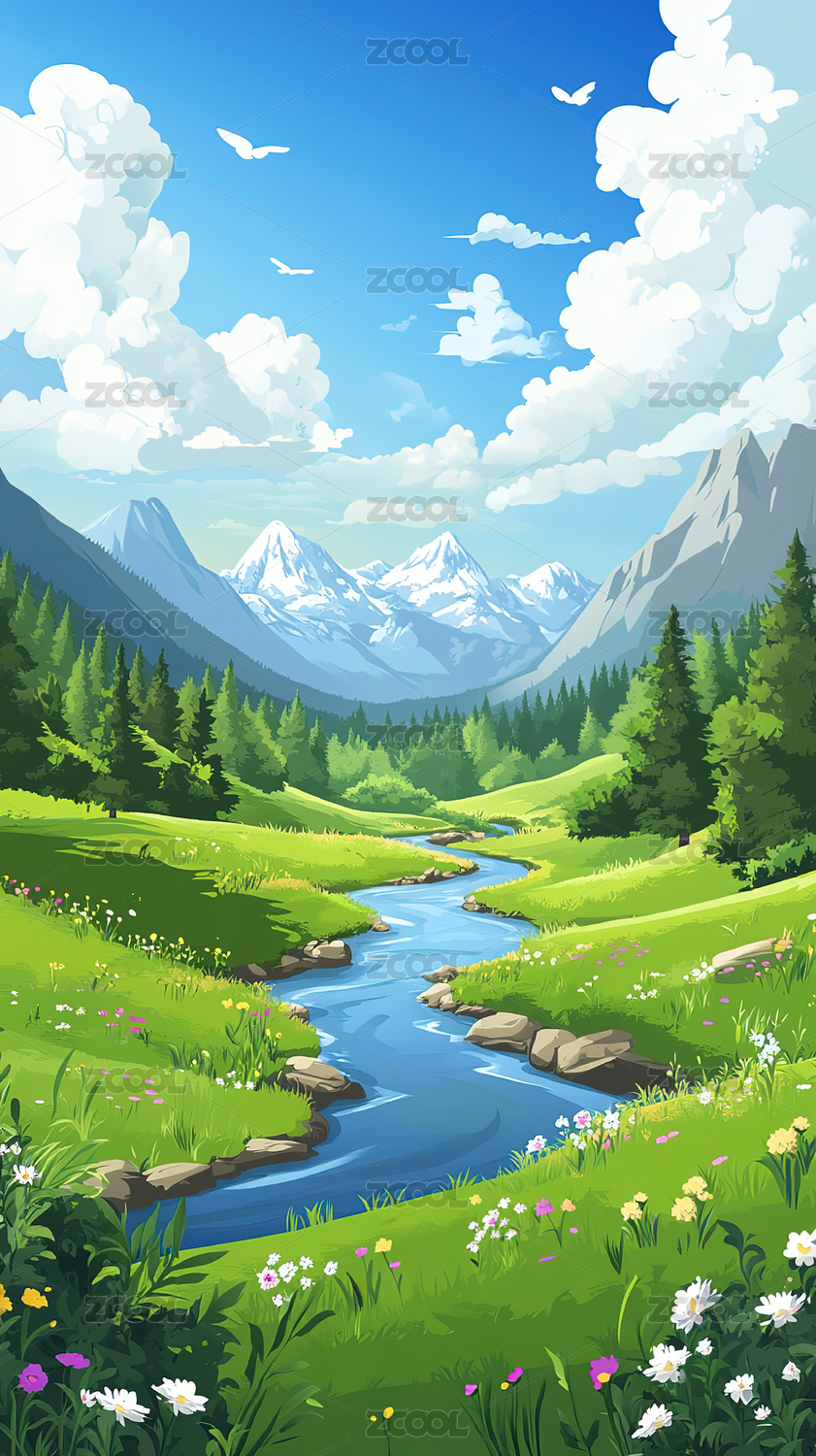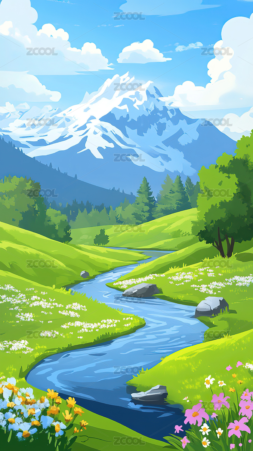 美丽的山河溪流风景插画