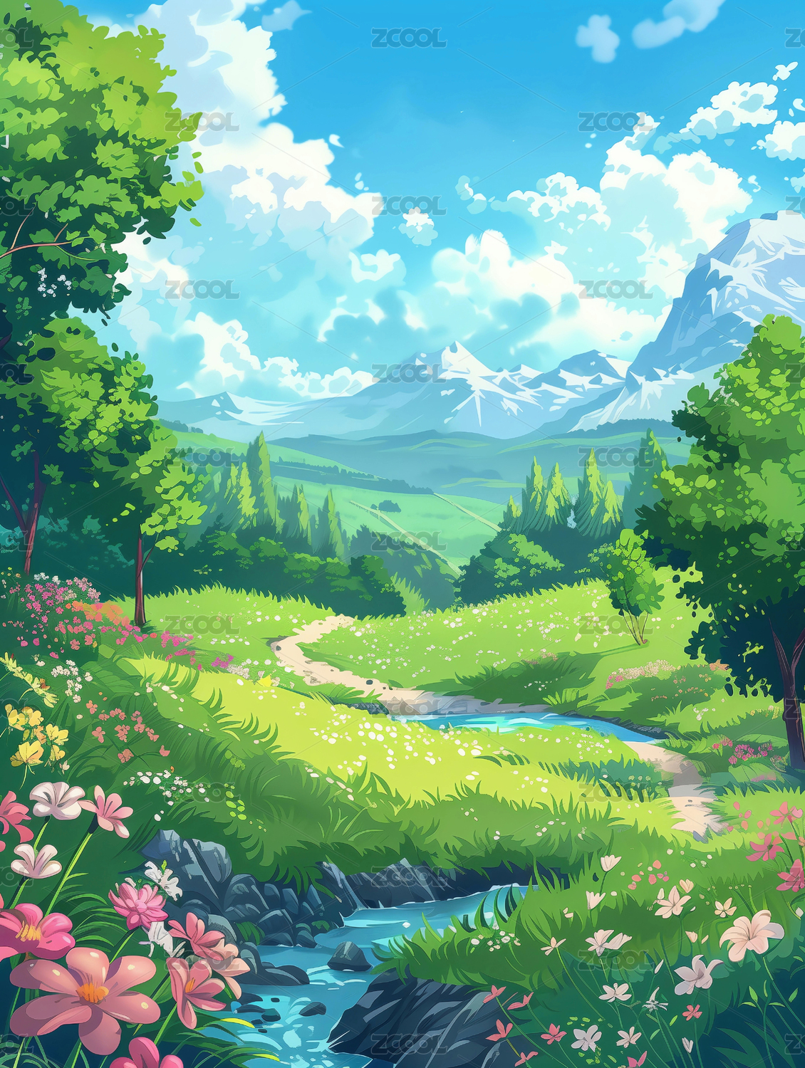 卡通草地远山自然风景