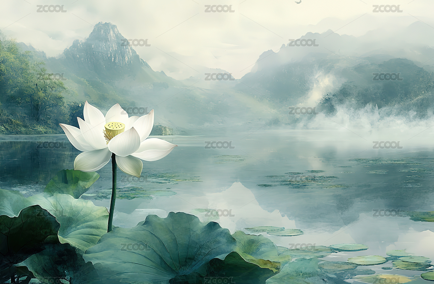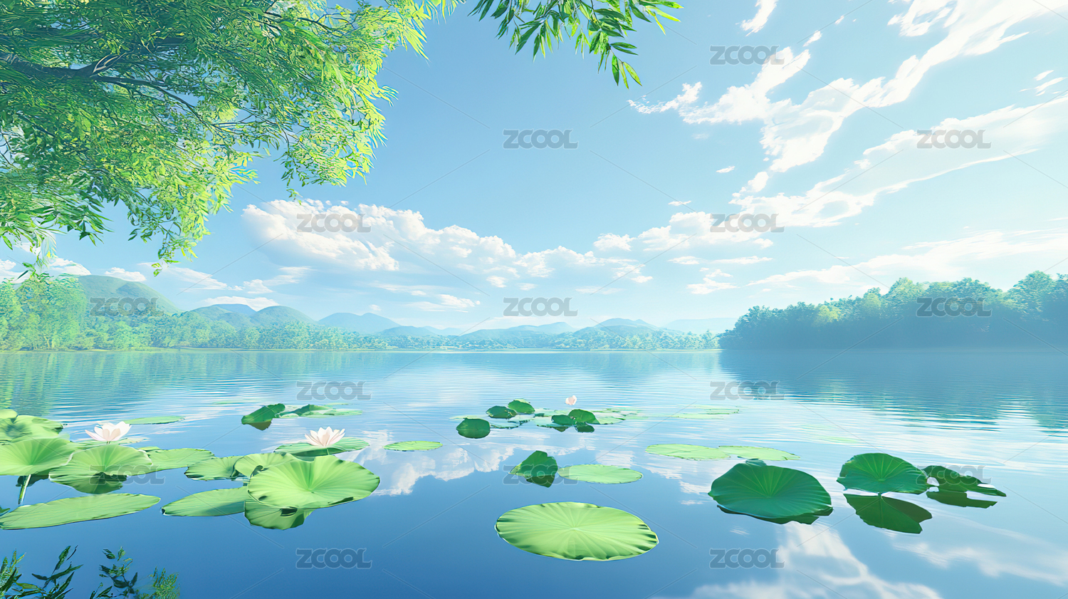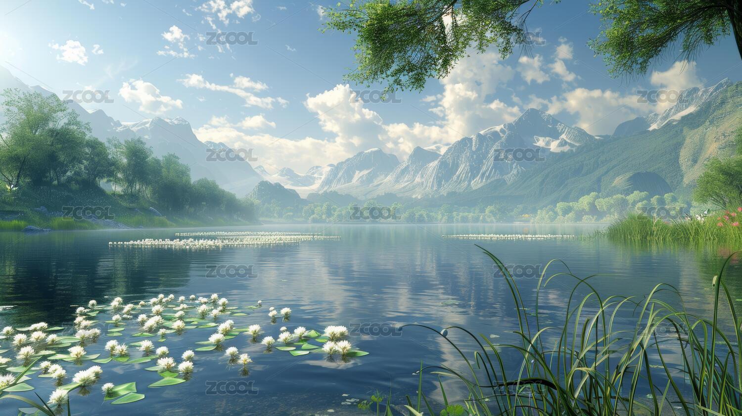 宁静的山谷湖泊远处是白雪皑皑的山脉