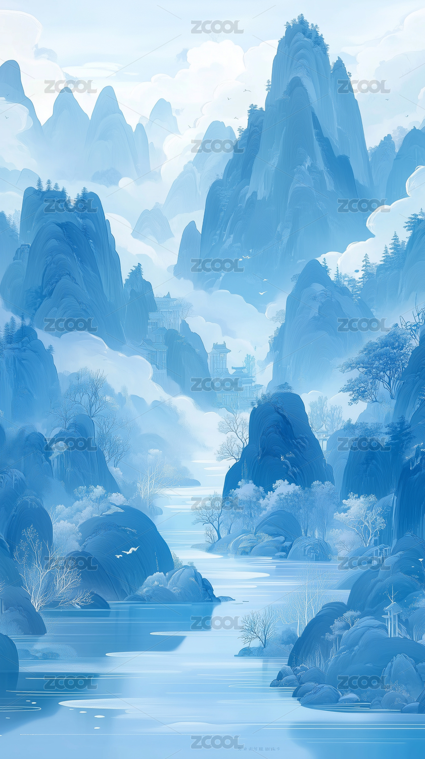 极简,山水,亭子,蓝色,复古,印花,山,水,国风,国潮
