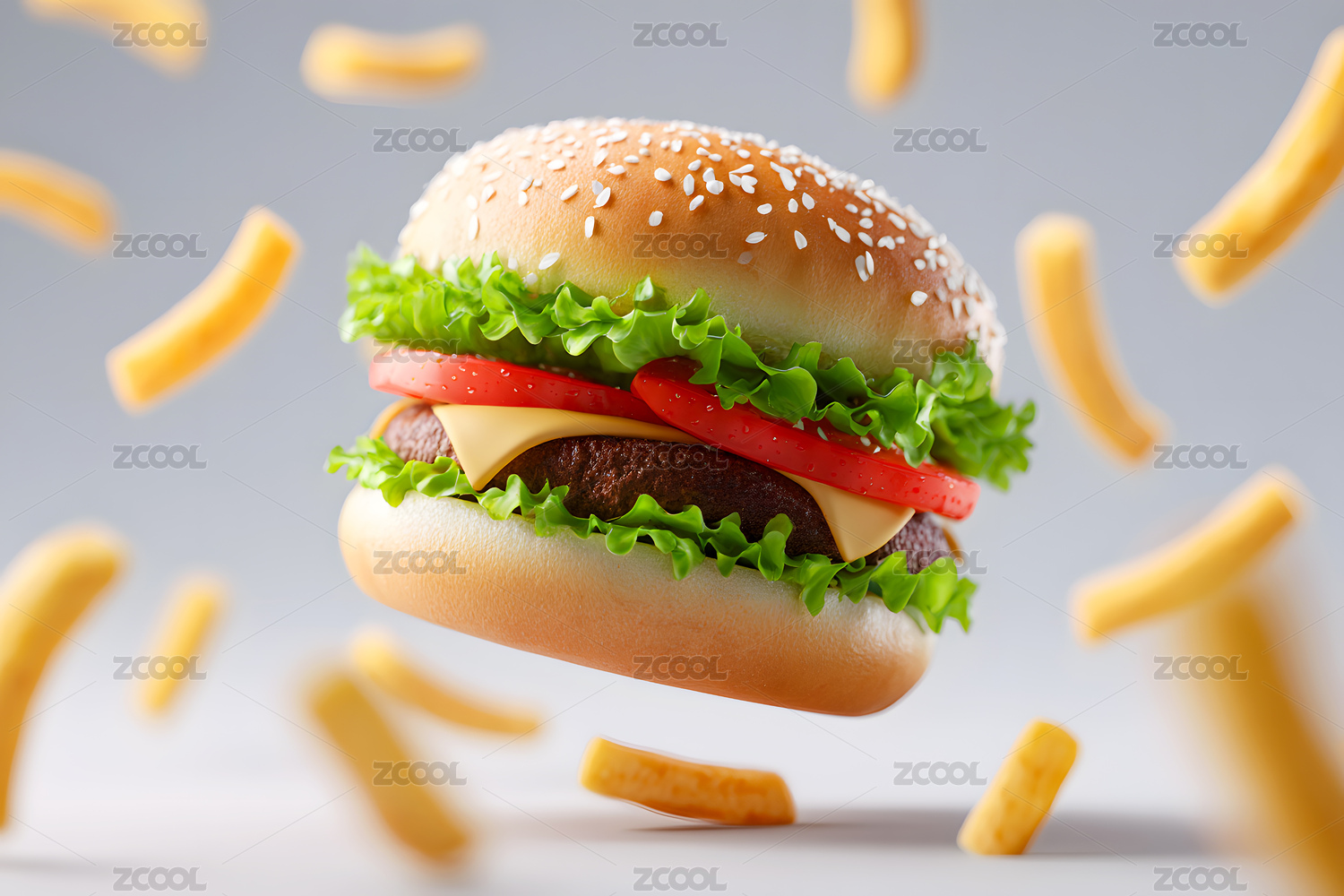 汉堡和薯条飞散在空中