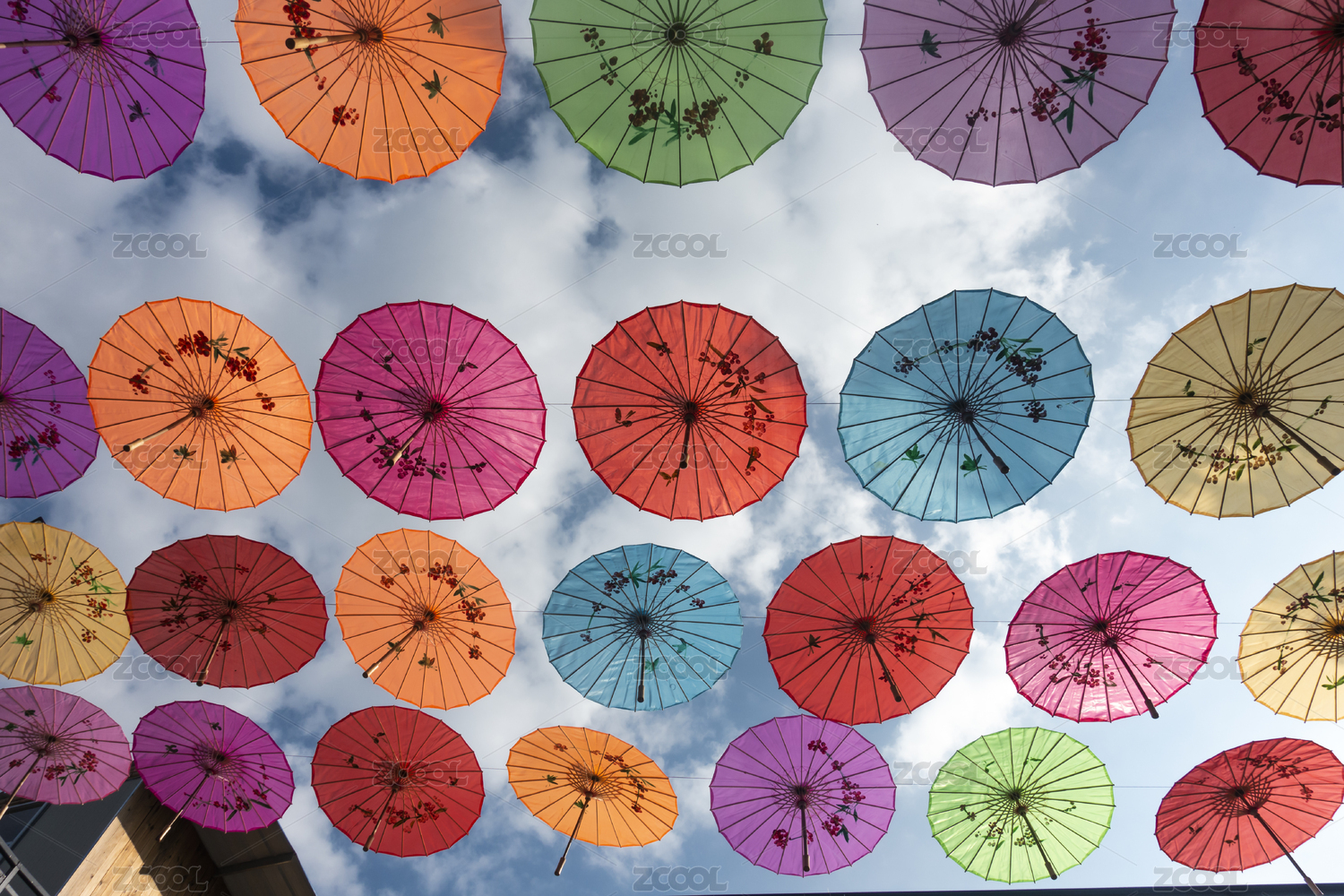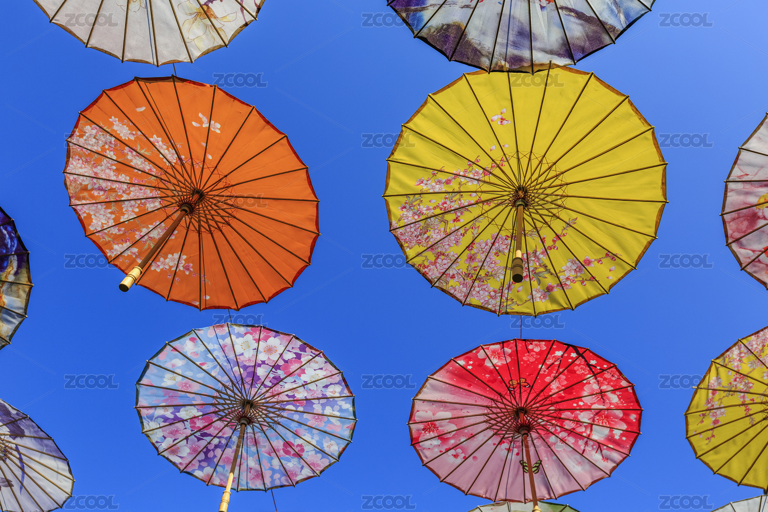 悬挂空中的五颜六色的油纸伞