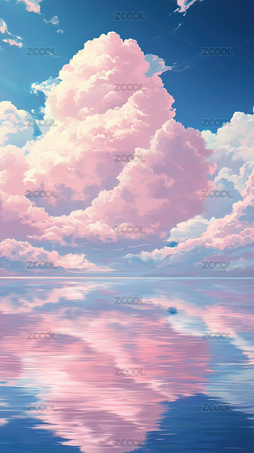 平静海面上的粉色云朵
